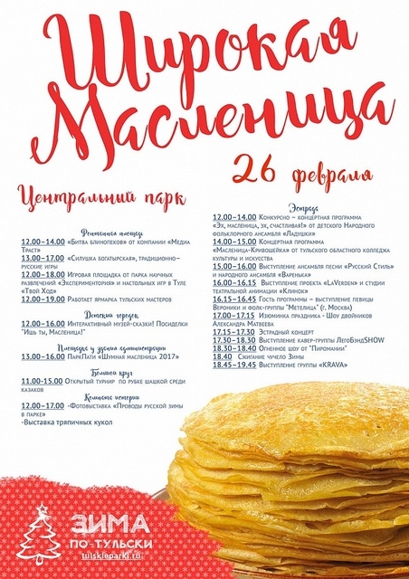 Туляков приглашают на битву блинопеков, русские забавы и конечно, на традиционное сжигание чучела Масленицы.