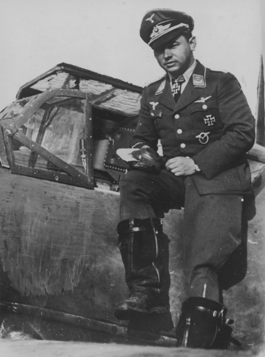 Сбитый Бабушкиным немецкий летчик-истребитель обер-лейтенант Ганс «Асси» Хан у истребителя Мессершмитт Bf.109E.
