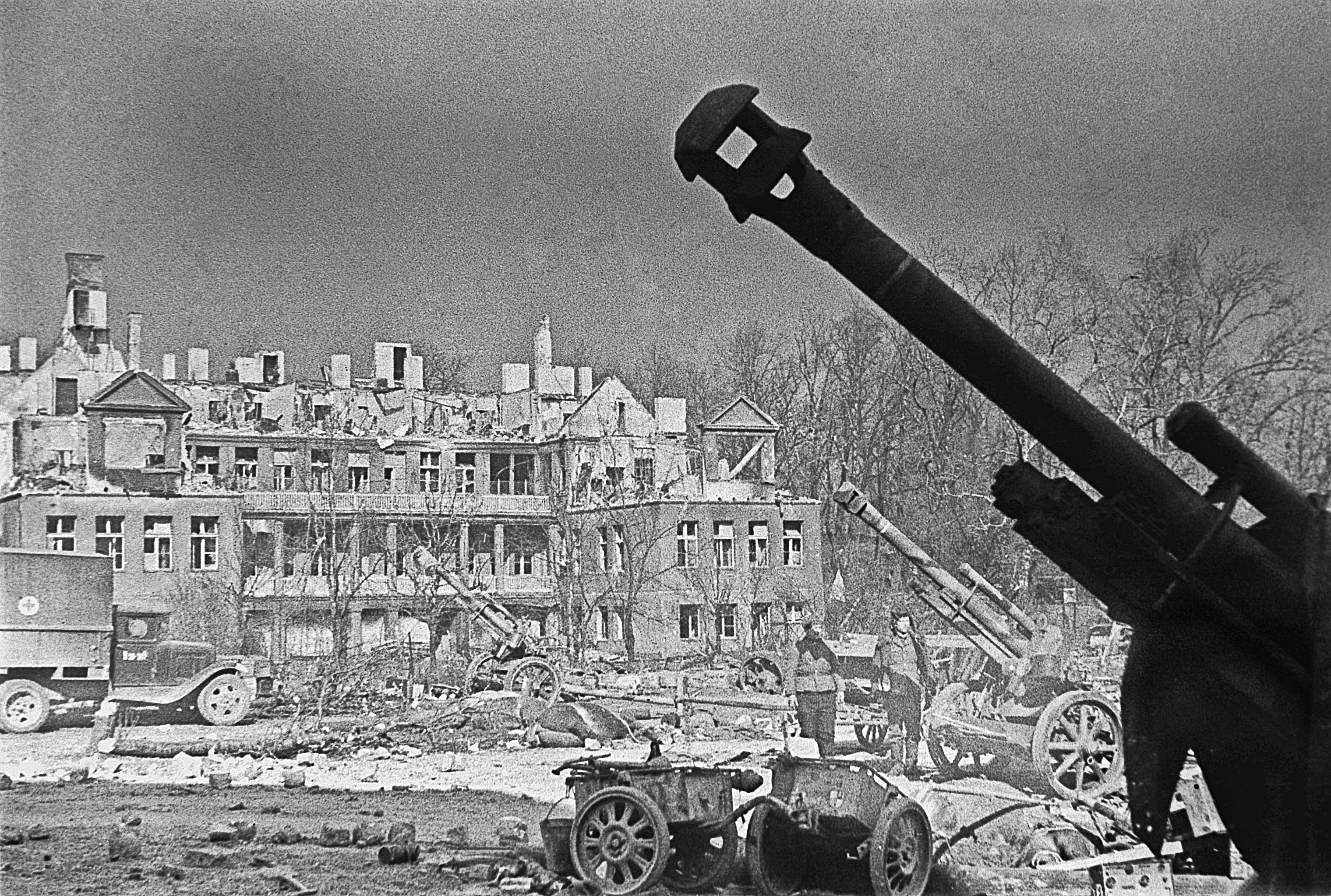 Разбитая немецкая батарея 105-мм полевых гаубиц leFH 18/40 (10,5cm leFH 18/40) в Кенигсберге.