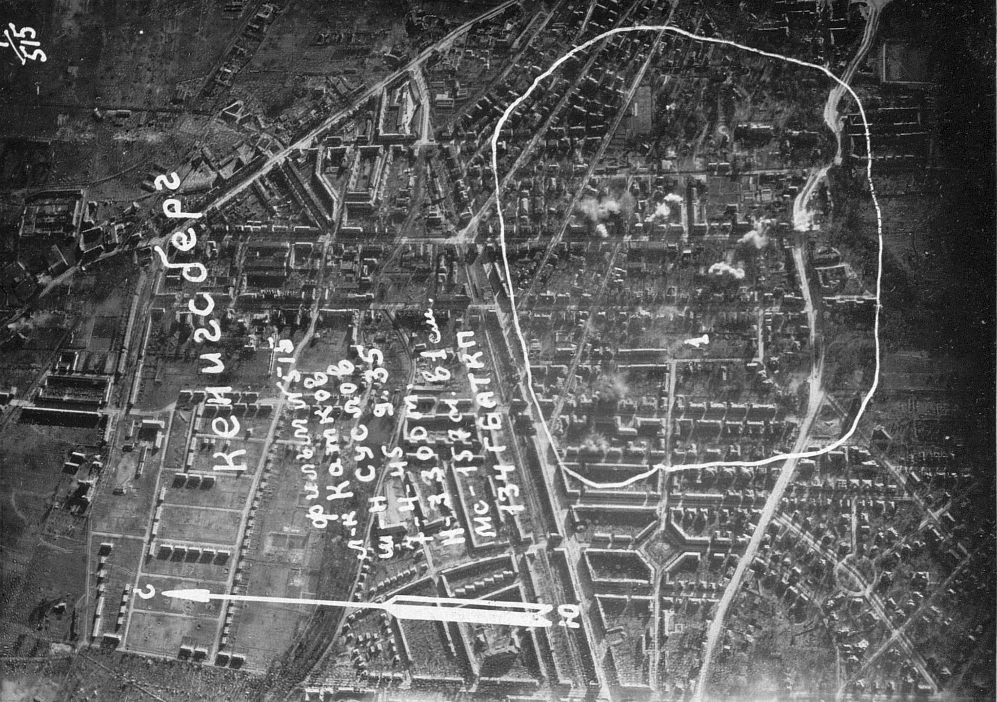 Фотоконтроль результатов бомбового удара по крепости Кенигсберг. Удар наносился 7 апреля 1945 года группой самолетов Пе-2 6-й Гв. БАД.