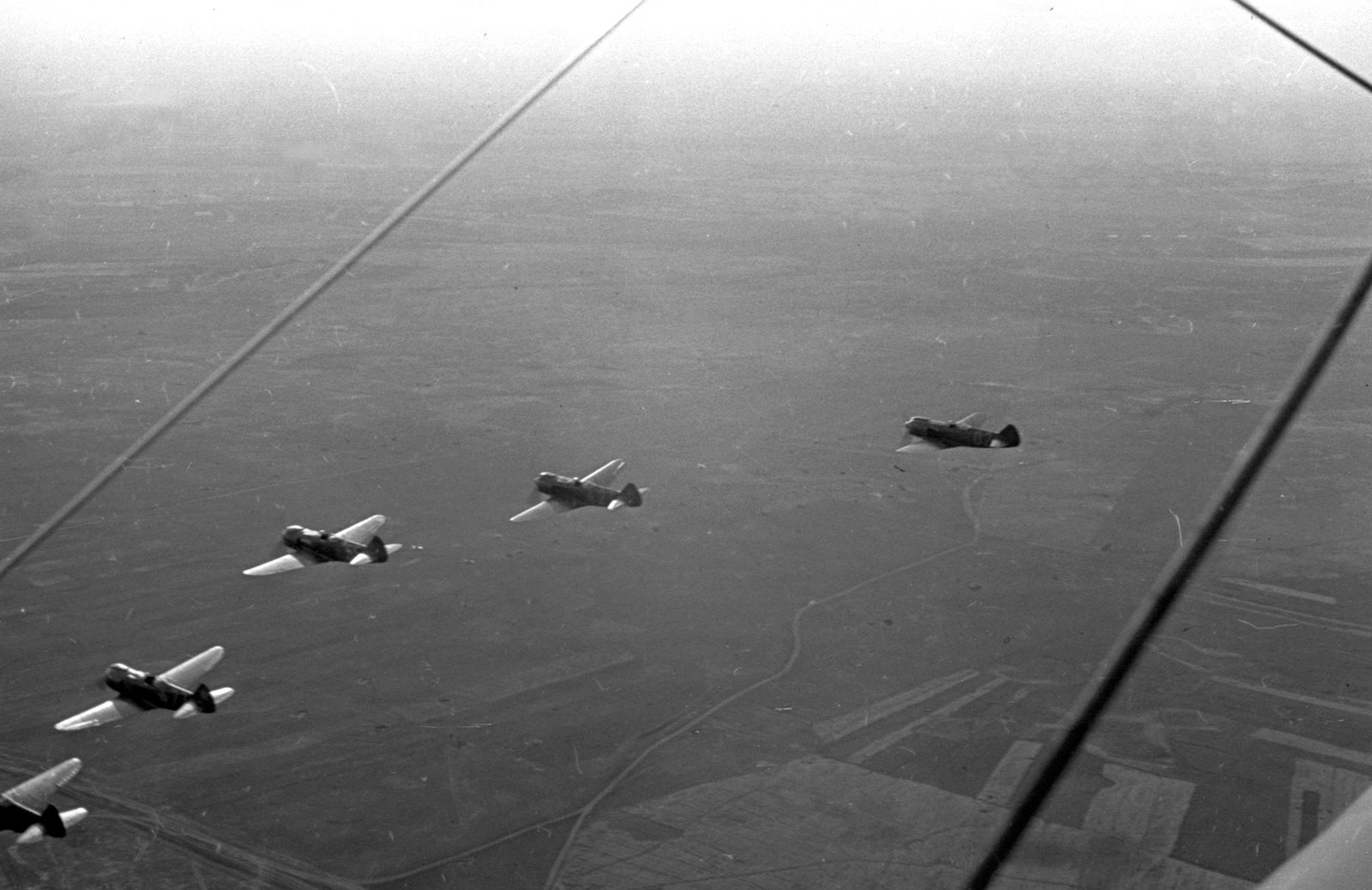 Группа советских истребителей Ла-5 в полете. Снимок сделан с борта самолета У-2.