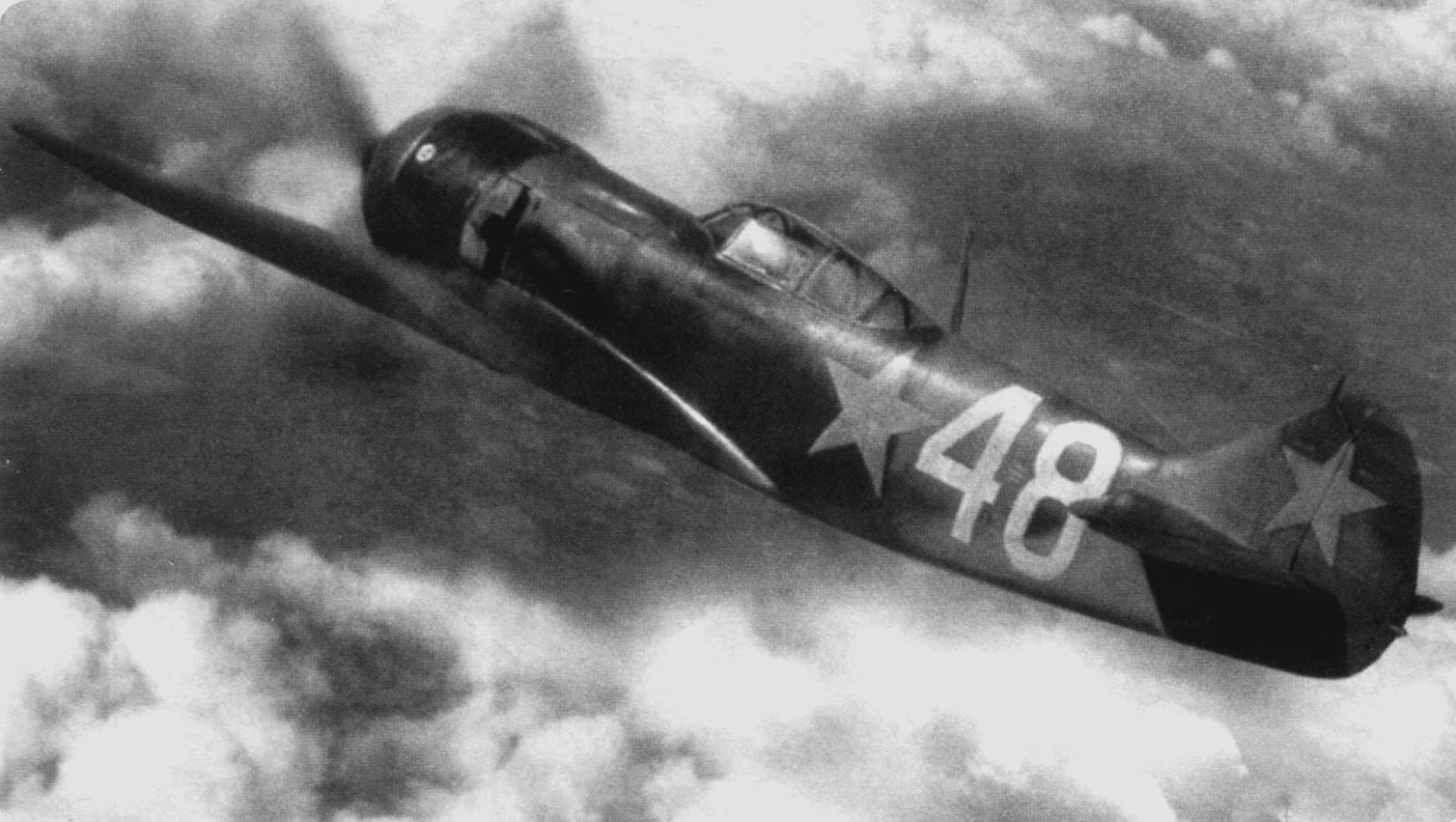 Советский истребитель Ла-5Ф из состава 8-й Гвардейской истребительной авиадивизии в полете. Район Курской дуги.