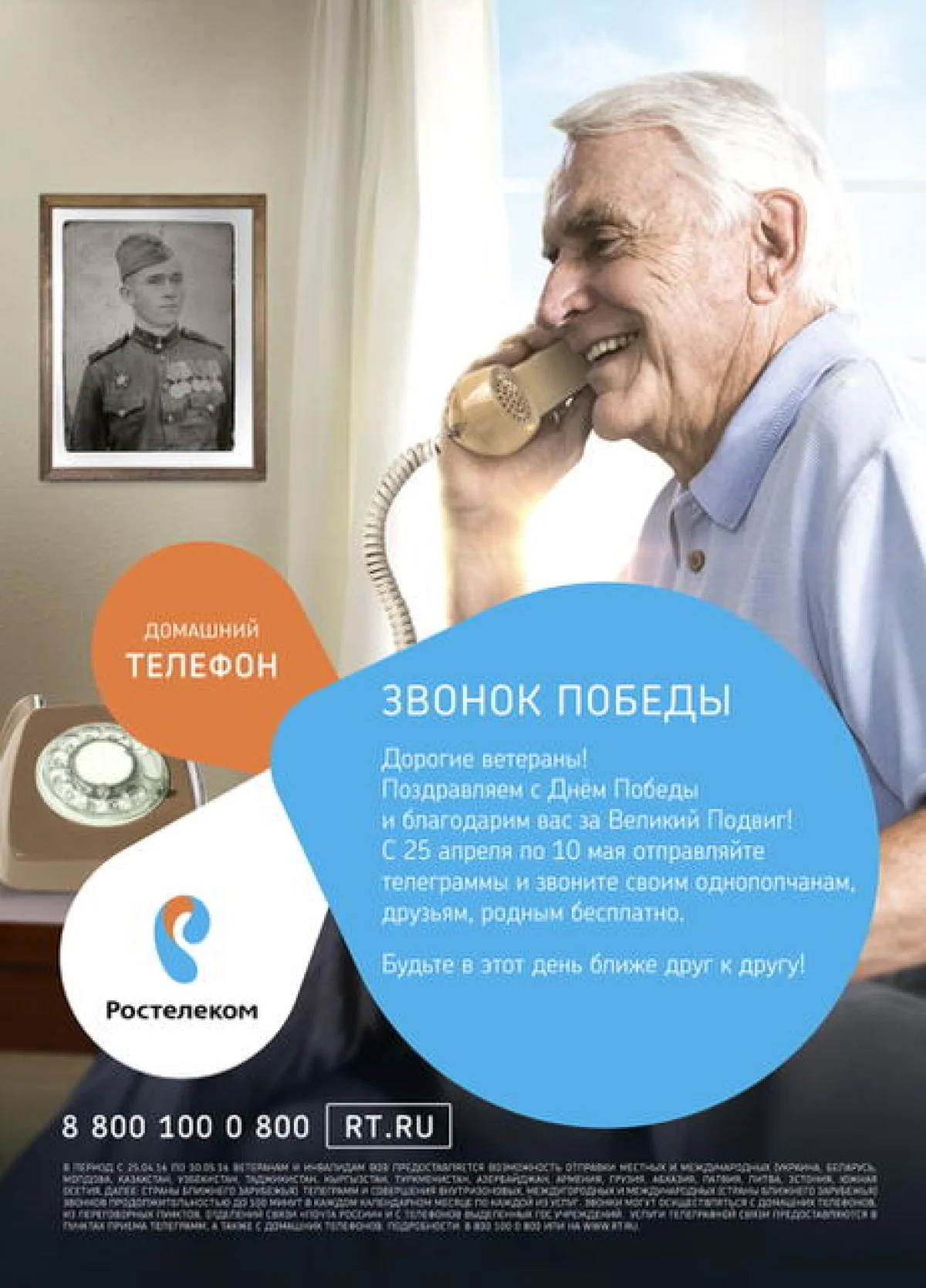 В честь Дня Победы «Ростелеком» традиционно дарит ветеранам и инвалидам Великой Отечественной войны возможность бесплатно пообщаться с однополчанами, родными и близкими в других городах России и ближнего зарубежья.