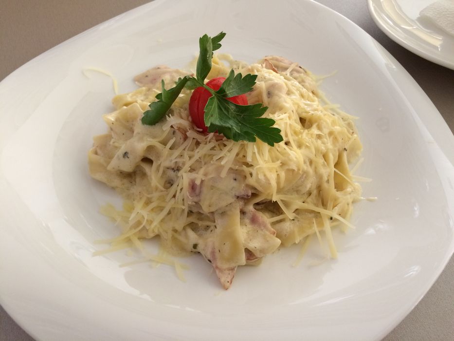 Паста «Карбонара». Макароны с ветчиной и соусом. Отдаленно действительно напоминает «Карбонару», но за 330 рублей могло бы быть и лучше. Съедобно, хоть и сухо. Желтка мало, сливок мало, пармезана мало (если это вообще был пармезан), перца - нет ни грамма.