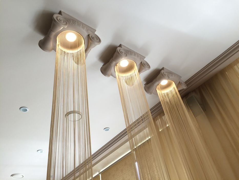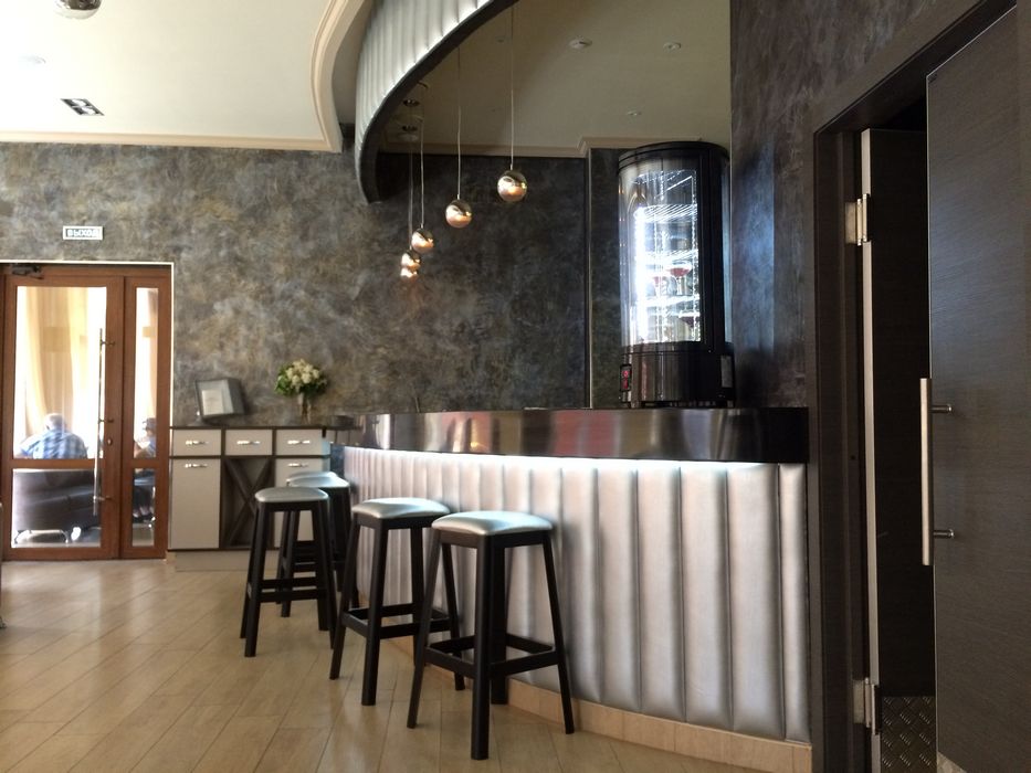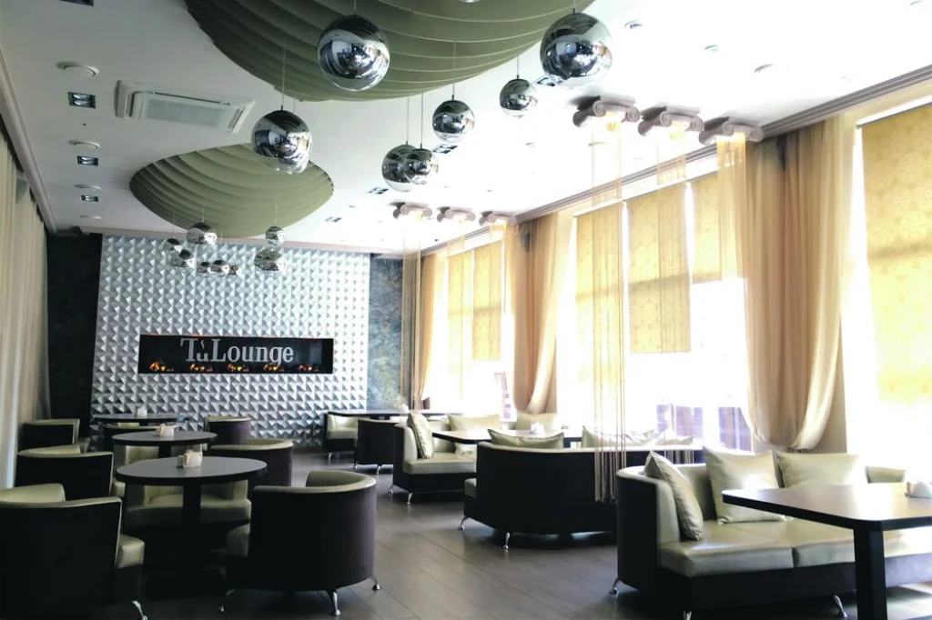Интерьер выполнен с претензией на респектабельность, проще говоря, чтоб было «богато». Зал утопает в бежевом цвете, начиная от ламината и заканчивая кожаными диванчиками и креслами. Золотистые и серебристые оттенки добавляют изысканности. Какой-то определенный стиль выделить трудно: сверкающие шары на потолке, рельефные стены, отдающие хай-теком, биокамин с языками пламени, искусственная лепнина под потолком, воздушные колонны, свисающие золотистыми нитями. «Ну что вы, это же чистой воды лаунж, даже из названия понятно», – наверняка возразили бы нам владельцы заведения.