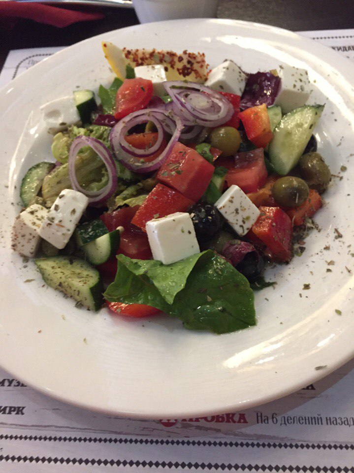 Я взял себе один из самых «дешевых» супов – томатный суп французских моряков (320 р.). Еще меня жутко заинтересовало блюдо (мясное трио с картофелем и грибами - 610 р.) из трех мясных медальонов, которого не оказалось на картинках меню. Официантка описала его как крайне огромное, «мужское» и сытное. Дама взяла себе греческий салат (330 р.).