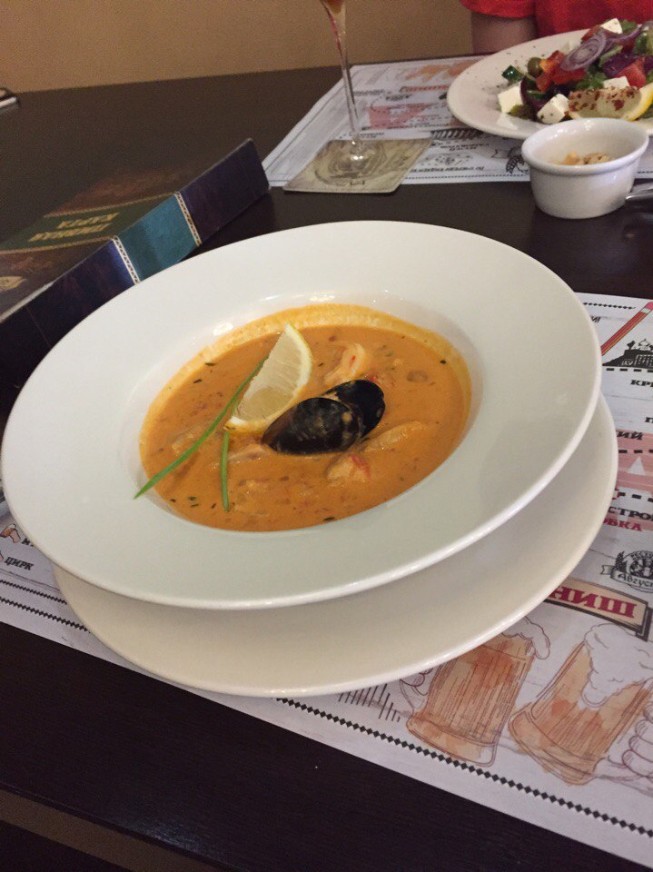 Далее следовал суп. Нежный вкус с кисловатым помидорным оттенком. Очень напоминает пюре, вкусно и приятно. Картину портят только нечищеные мидии и хвосты креветок. Как это вылавливать и чистить? Греческий салат неплохой, с очень вкусным маслом. Впрочем, как-то испортить такое простое блюдо — это надо постараться! «Мясное трио» оказалось не настолько «мужским», как рассказывали. Обмани меня! Три медальона из говядины, курицы и свинины размером с маленькие круассаны, несколько долек поджаренного картофеля и сливочный соус с грибами. Все это занимает половину тарелки, вторая часть которой отведена под огромный салатный лист. Приготовлено хорошо, но надувательство чувствуется за версту. Итог получается двояким, ведь здесь действительно хорошо готовят. Но ответ на вопрос «Стоит ли за это столько платить?» однозначно отрицательный. Стану ли я советовать прийти сюда? Нет. Повара не зря едят свой хлеб.