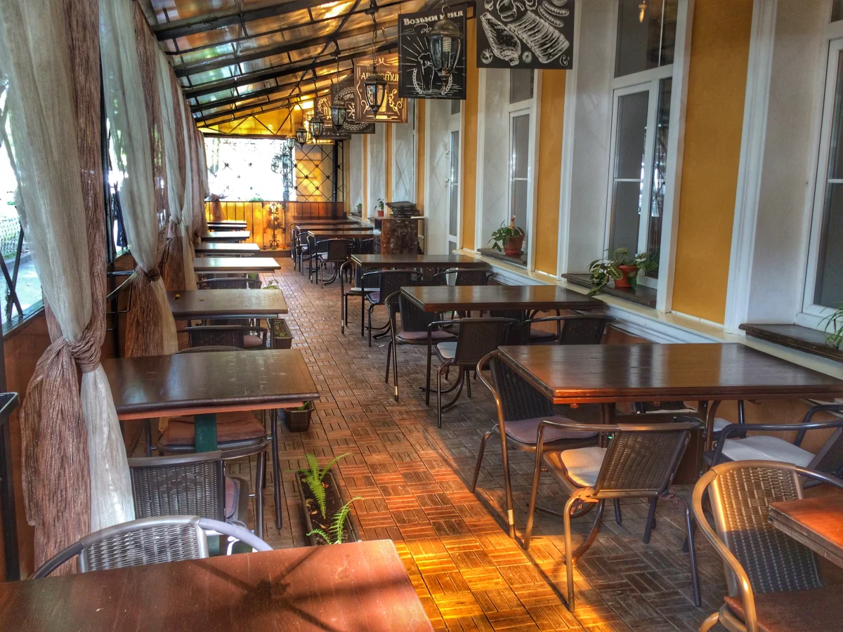 Вход в заведение выполнен в стиле средневековой таверны-трактира: выглядит заезженно и довольно серо. Маленькая и уютная на вид веранда, огороженная так, что попасть на нее можно, только пройдя через главный зал. Изначально «шпион» со своей спутницей хотели попасть на нее, но входа с улицы нет, что и смущает. Почему нельзя было сделать веранду более открытой, тем самым избавив гостей от лишних неудобств, остается загадкой.
