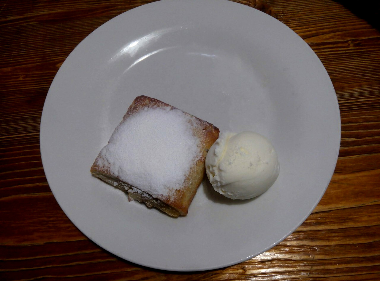 Но, надо признать, штрудель вкусный. Тесто очень нежное и просто тает во рту, при этом ничего не разваливается, а приборы легко справляются, не размазывая начинку по тарелке. Запечёные яблочки с изюмом и нотками корицы — просто нирвана для вкусовых рецепторов. В общем, за вкус — пятёрка, за оформление — неуд.