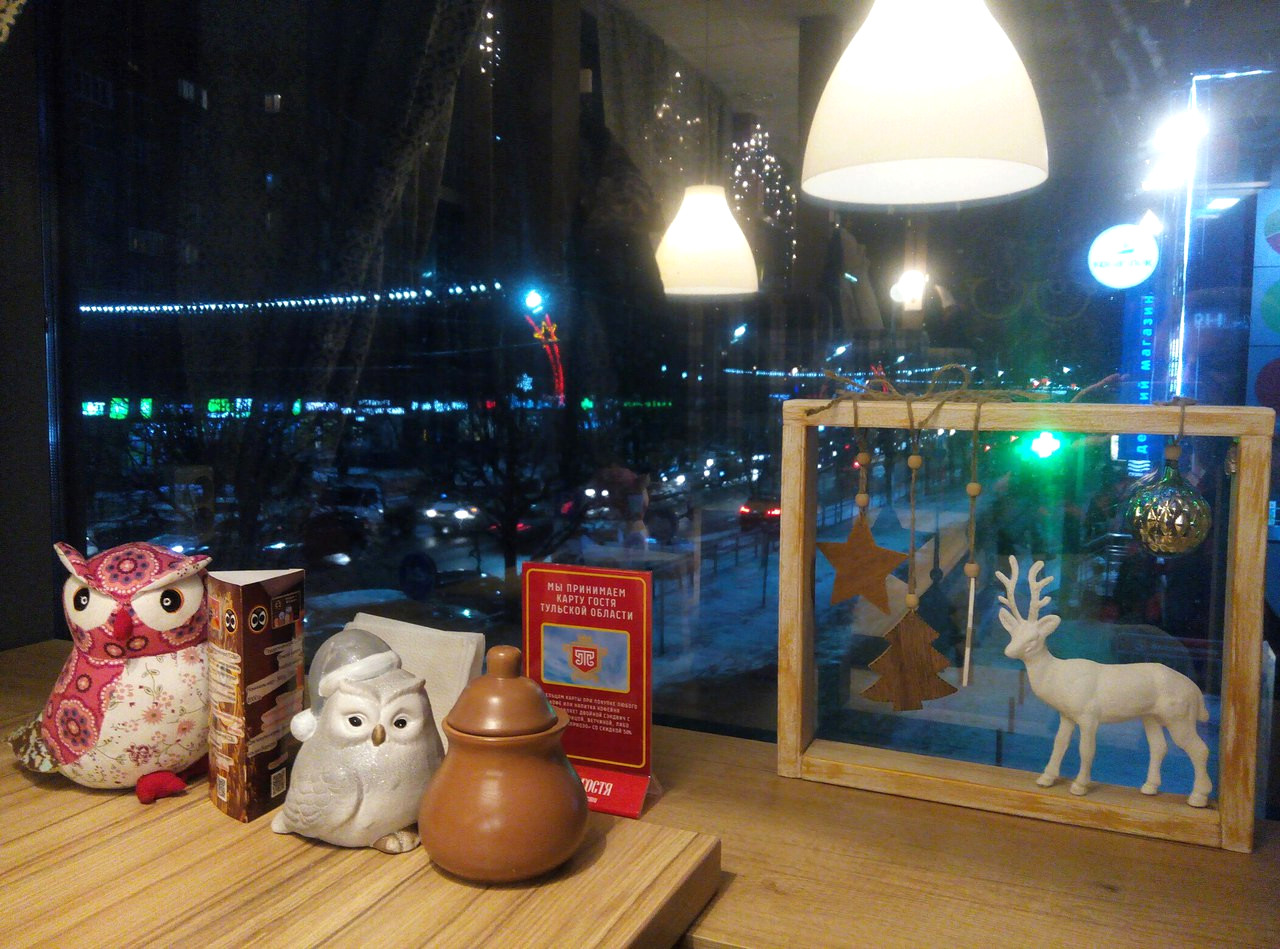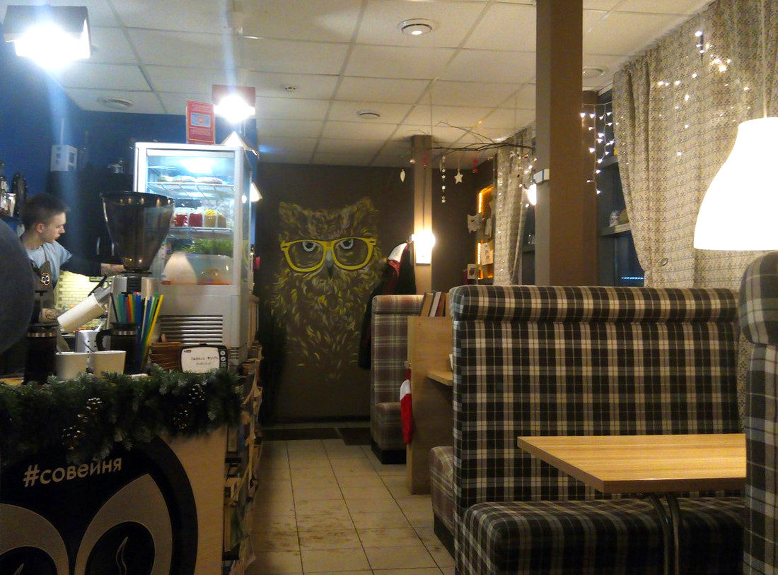 Уютные клетчатые диванчики, усеянные мягкими подушками, несколько десятков всевозможных сов (не настоящих, конечно), вид на заснеженный Красноармейский проспект, очень приятные и внимательные официанты… Да, именно в таких местах хочется проводить долгие зимние вечера.