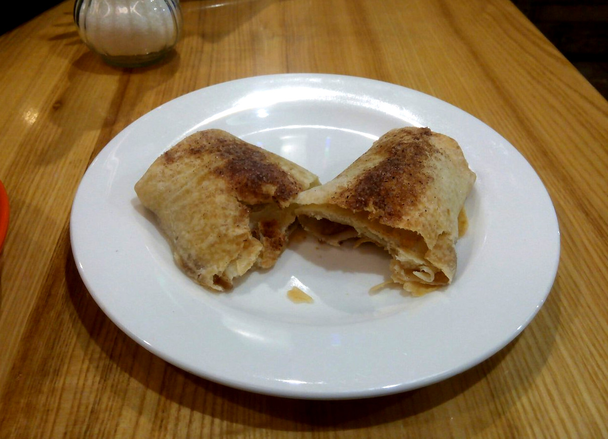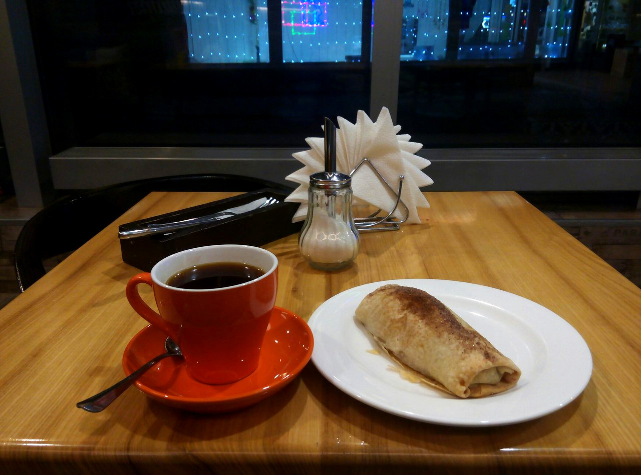 Спустя полчаса безуспешных скитаний по центру города, шпион забрёл в кафе-пекарню «Два Пекаря», что в начале Красноармейского проспекта. Уж не знаю, в каком месте тут спрятана пекарня, но запах ароматной выпечки почему-то в нос не ударил. Вместо этого за стеклом витрины лежали утратившие привлекательность десерты, и, по всей видимости, грустили, что их никто не покупает. На одном из ценников значилось - «Штрудель». Присмотревшись, я увидела свернутое и посыпанное корицей тесто, похожее на блин и шаурму одновременно. Но цена подкупала — всего 49 рублей.