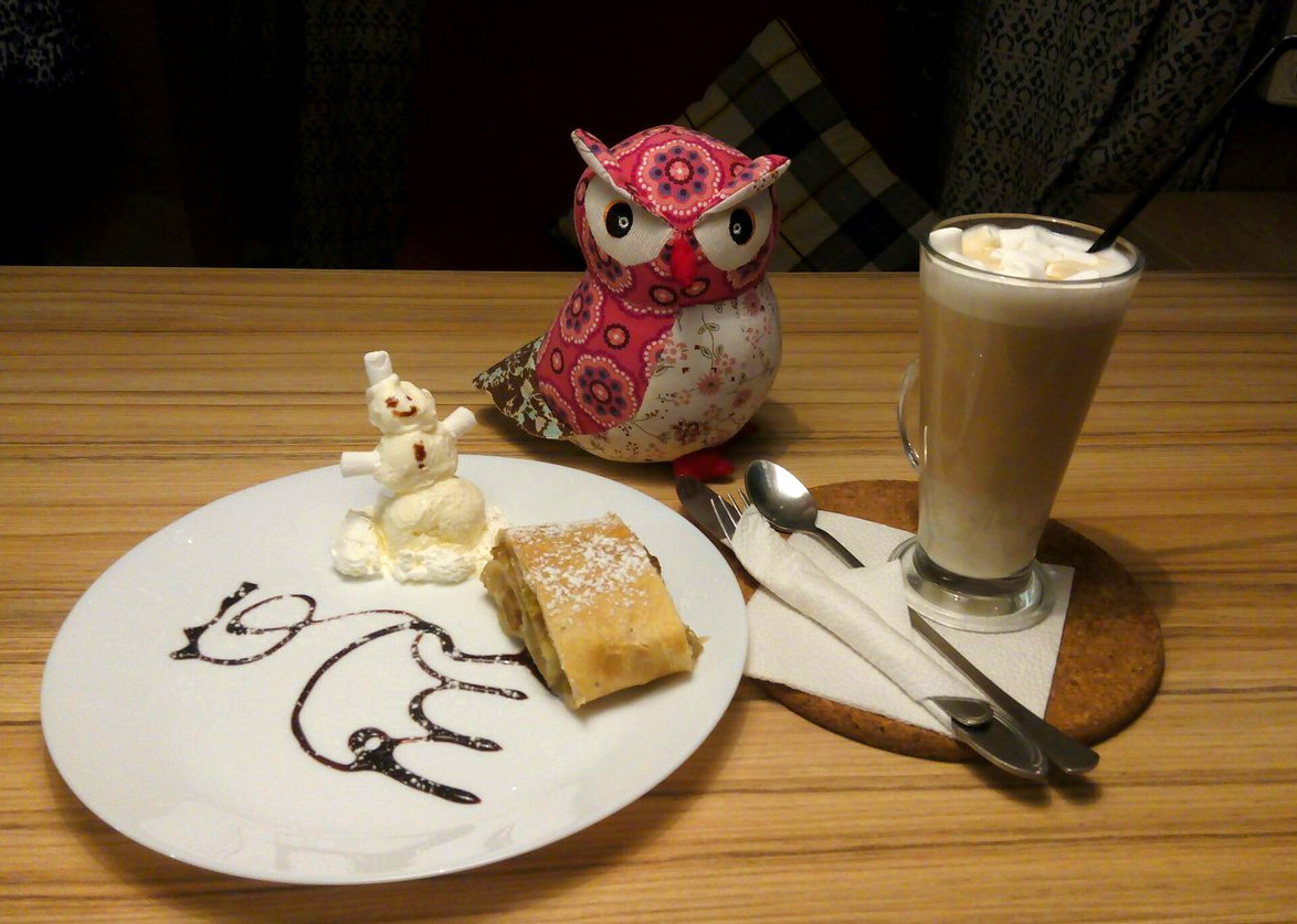 Про местный штрудель надо не рассказывать, а показывать. Вот так в «Сове» умеют поднять настроение. Замечу, что стоимость сего произведения искусства такая же, как и в предыдущем кафе. Но, как говорится, почувствуйте разницу! Итак, ритуал первого кусочка: ломтик тёплого ароматного штруделя с грушевой начинкой, раскрывающегося тающей нежностью. Следом – завиток пломбира, освежающего сливочной прохладой. В завершении — немного шоколадного соуса. И глоток латте со сливочным сыром, который, наверно, не готовят больше нигде в Туле. Это просто божественно.