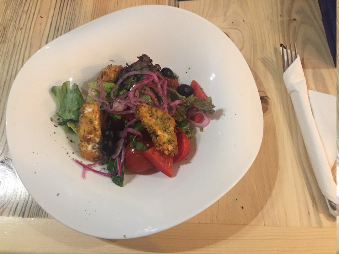 Выбор шпиона пал на блюда греческой кухни. Они, по своей сути, легкие и вкусные - то, что нужно в жаркий день. Первым принесли традиционный греческий салат или, как называют его местные жители, «хориатики» (240 рублей). Заявленный вес - 180 гр. В его состав вошли помидоры, огурцы, сладкий перец, лук, сыр фета и маслины. Заправлен оливковым маслом с солью, черным перцем, лимоном и орегано. На вкус довольно сносно. Чувствуется приятный хруст свежих овощей. Лук, по всей видимости, замаринован и совершенно не горчит. Если говорить о классическом исполнении блюда, то ключевым компонентом салата является фета — традиционный греческий сыр из овечьего или козьего молока. Здесь она обжарена в панировке. Уместно ли это? Мне так не показалось.
