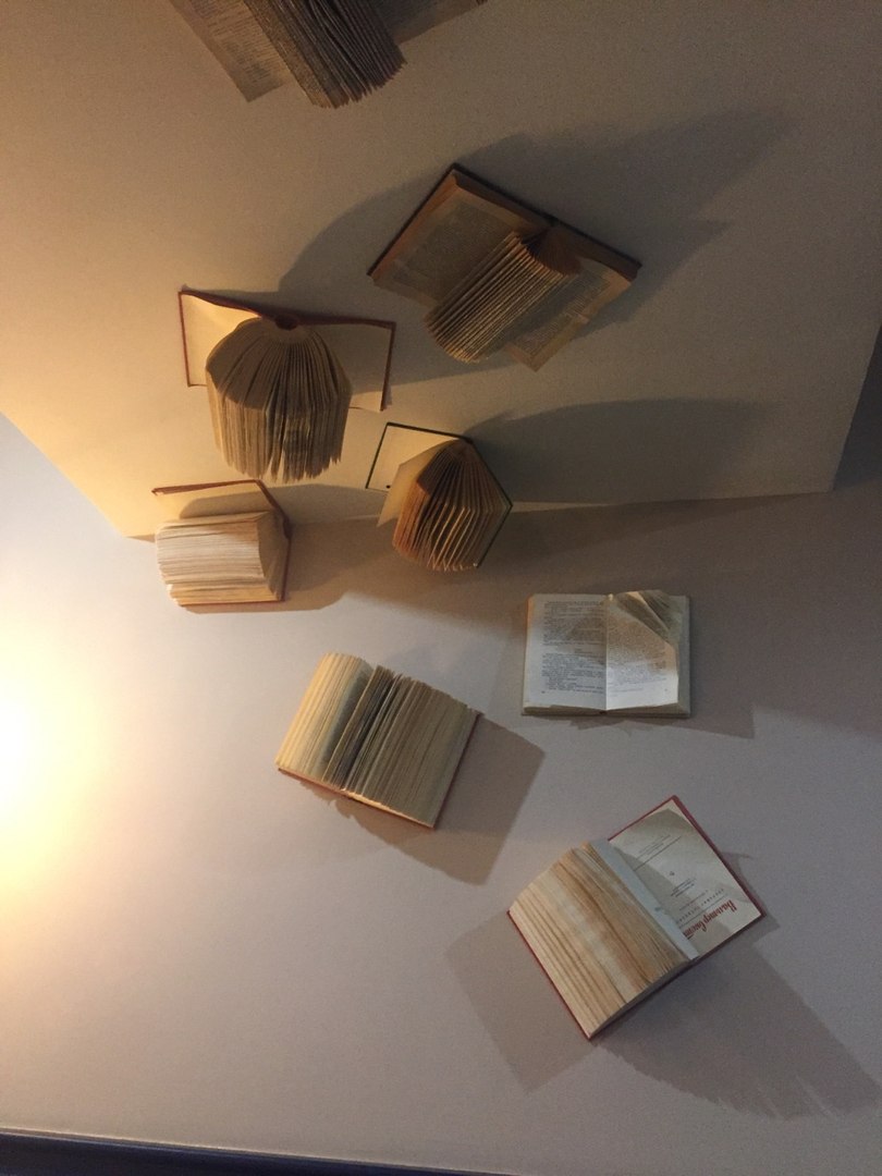Спускаемся ниже. Именно здесь размещаются столики. Здесь для интерьера выбраны более холодные тона. На стенах рамы и картины, книги. Последние размещаются даже на потолке.