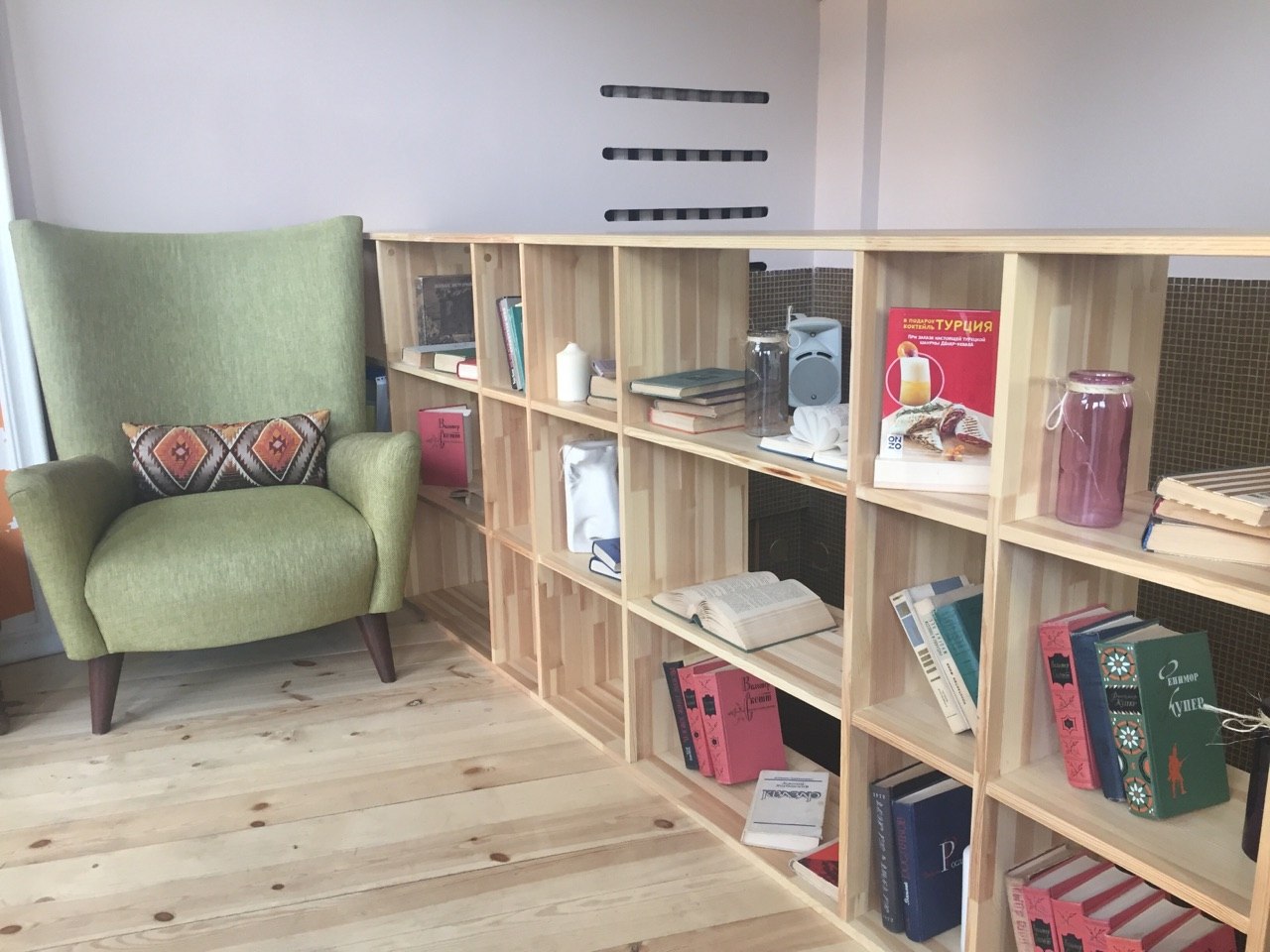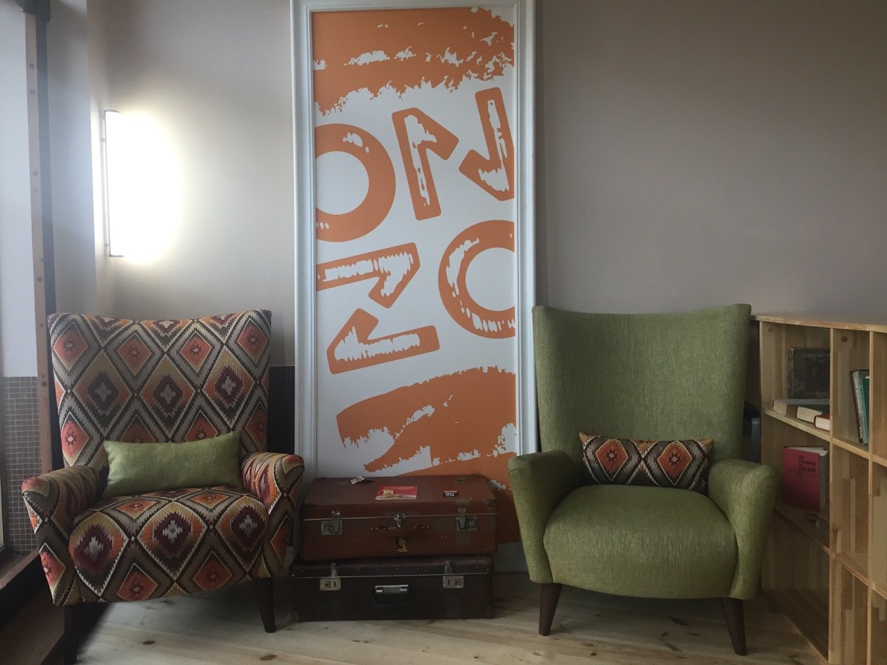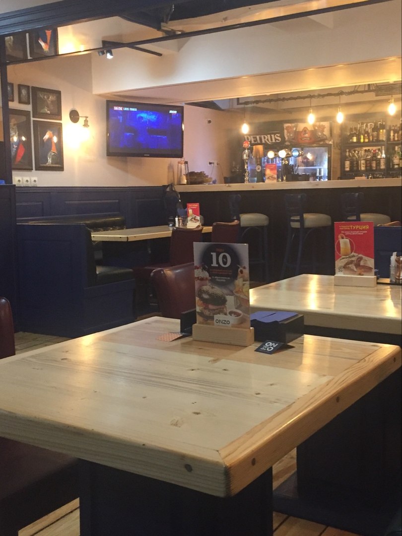 Заведение разместилось на месте бывшего бара «Советский спорт». Но на этом все пересечения «ONZO» с предыдущим общепитом заканчиваются. Открыв дверь, ты попадаешь в предбанник средних размеров. Здесь стоят два уютных кресла яркой расцветки, пара старинных чемоданов, выполняющих роль небольшого стола, стеллаж с книгами и баннер с названием заведения, обрамленным белой рамкой.