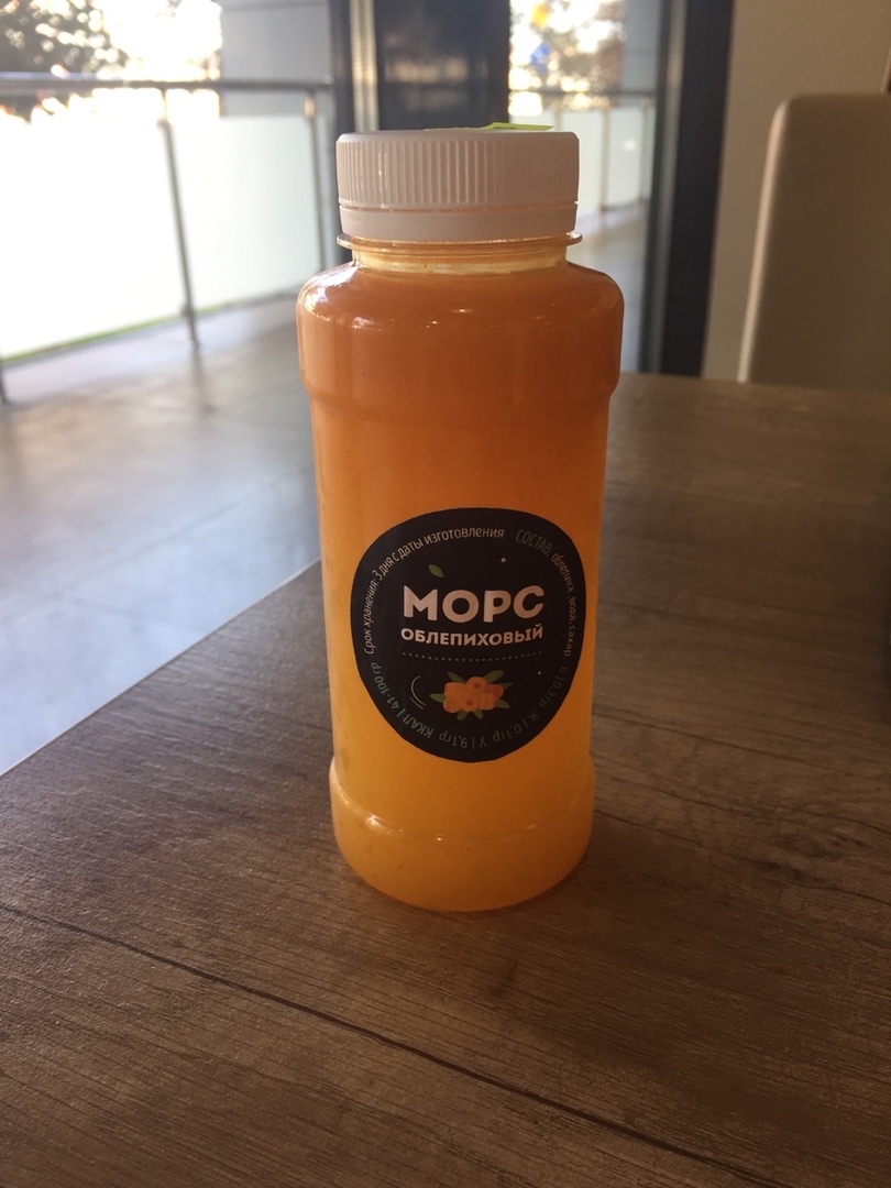 Облепиховый морс оказался полностью натуральным. Если верить этикетке, то в составе только облепиха, вода и сахар. Продается морс в бутылочке объемом 0,3. В жаркие деньки хорошо утоляет жажду.