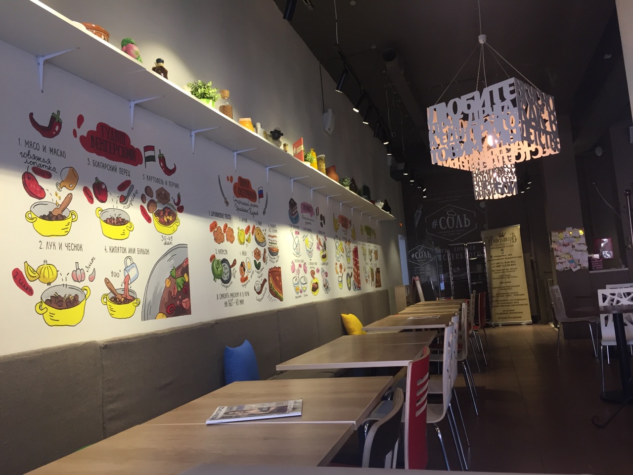 Название «СОЛЬ» находит отражениях в стенах кулинарной-лавки. У стены, декорированной крупными кристаллами розовой гималайской соли, встречает гостей хозяюшка «Солюшка».