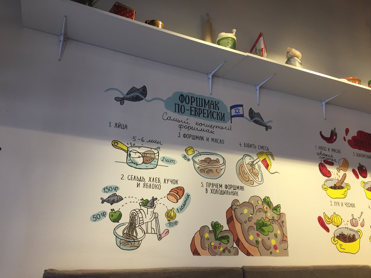 В зале художник отрисовал кулинарные рецепты. Среди них — форшмак по-еврейски, венгерский гуляш, пирог с осетриной, тирамису, банановые оладушки и яблочный пирог тарт татен.