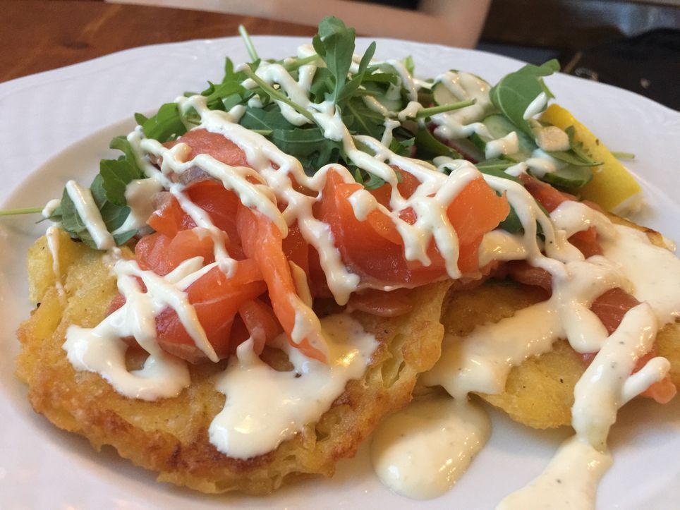 Салат с лососем тоже отличился пресностью. Соус (если это был соус) больше смахивал на сметану. Рукколу испортить сложно, поэтому повару это не удалось. А вот картофельные дранники явно были разогретые. Эх, как-то не по-ресторанному совсем.