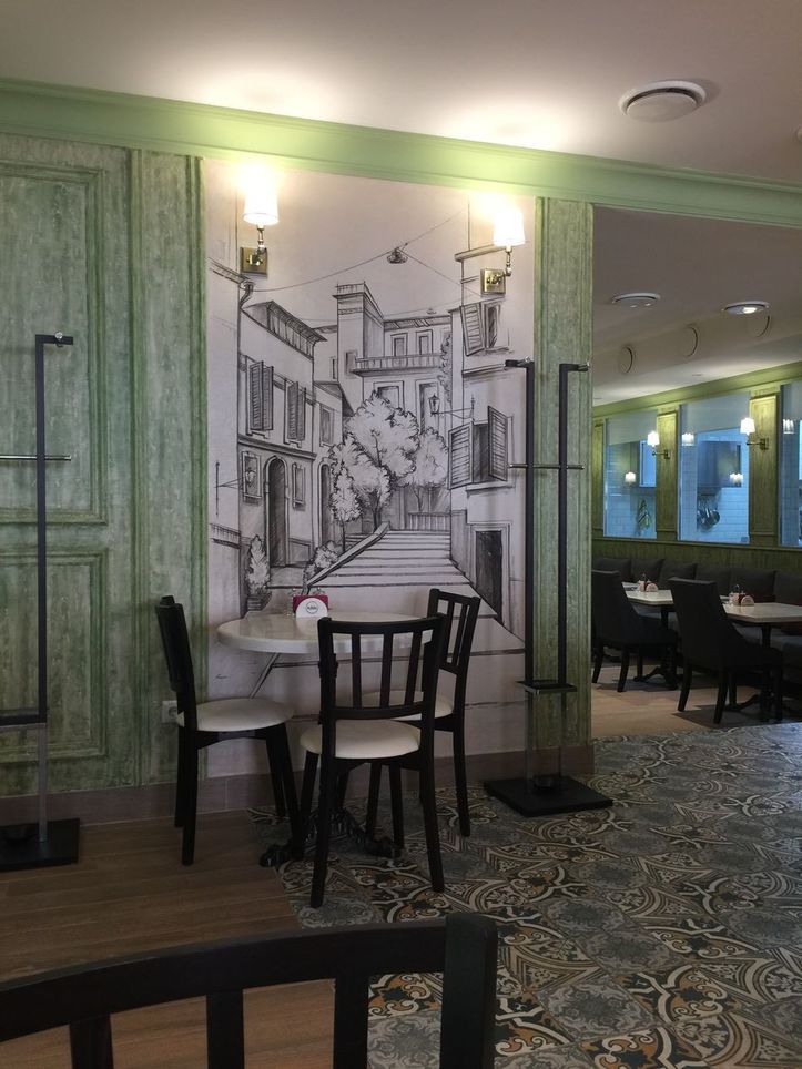 в пол, люстры-банки над баром, где размещены муляжи десертов всех сортов. Роспись по штукатурке, камин, украшенный