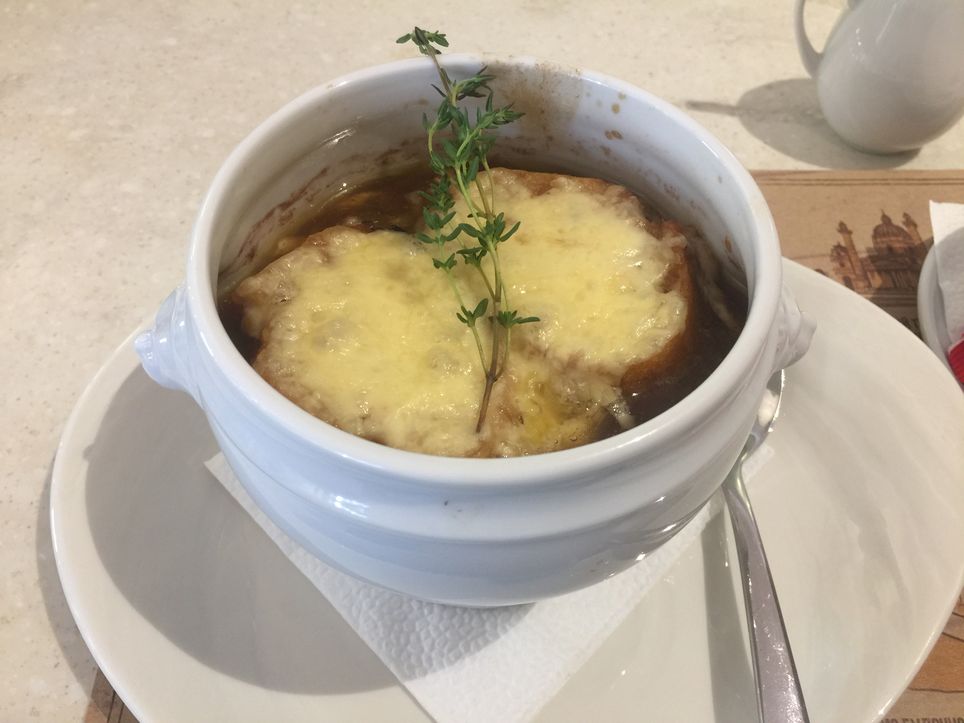 Очень быстро за кофе последовал луковый суп. Довольно «мужская» порция, я вам скажу. Бульон наваристый, горячий, сладковато-соленый, каким и должен быть. Две греночки, расплавленный сыр и веточка розмарина. На вид может и не очень аппетитно из-за цвета супа, но запах и вкус отличные. Так же как и кофе, суп медленно остывает. Причиной тому - довольно глубокая тарелка. Для быстрого бизнес-перекуса такой суп – не лучший вариант. Но если вы едите не спеша – то что надо.