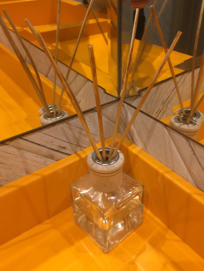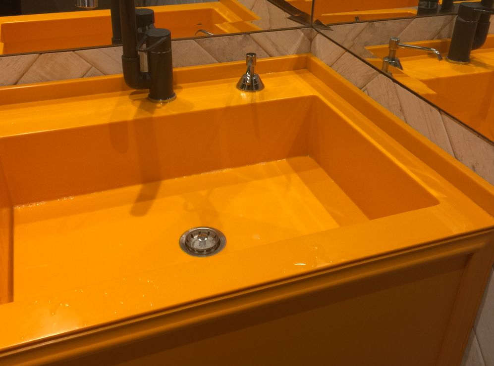 та же небрежная плитка, только уже на стенах, ярчайшая оранжевая раковина и большие зеркала. Жидкое мыло, бумажные