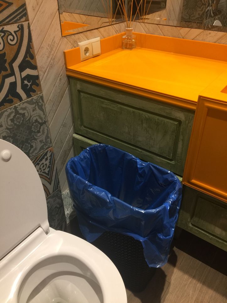 Сильно выбивается из общей картины мусорное ведро с пакетом цвета «вырви-глаз». Не самый лучший акцент