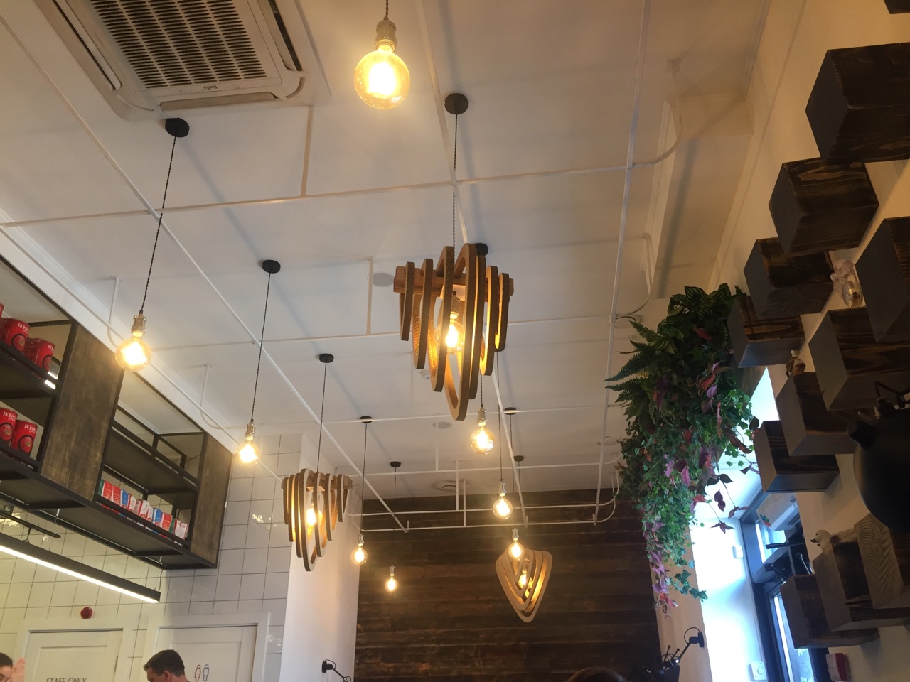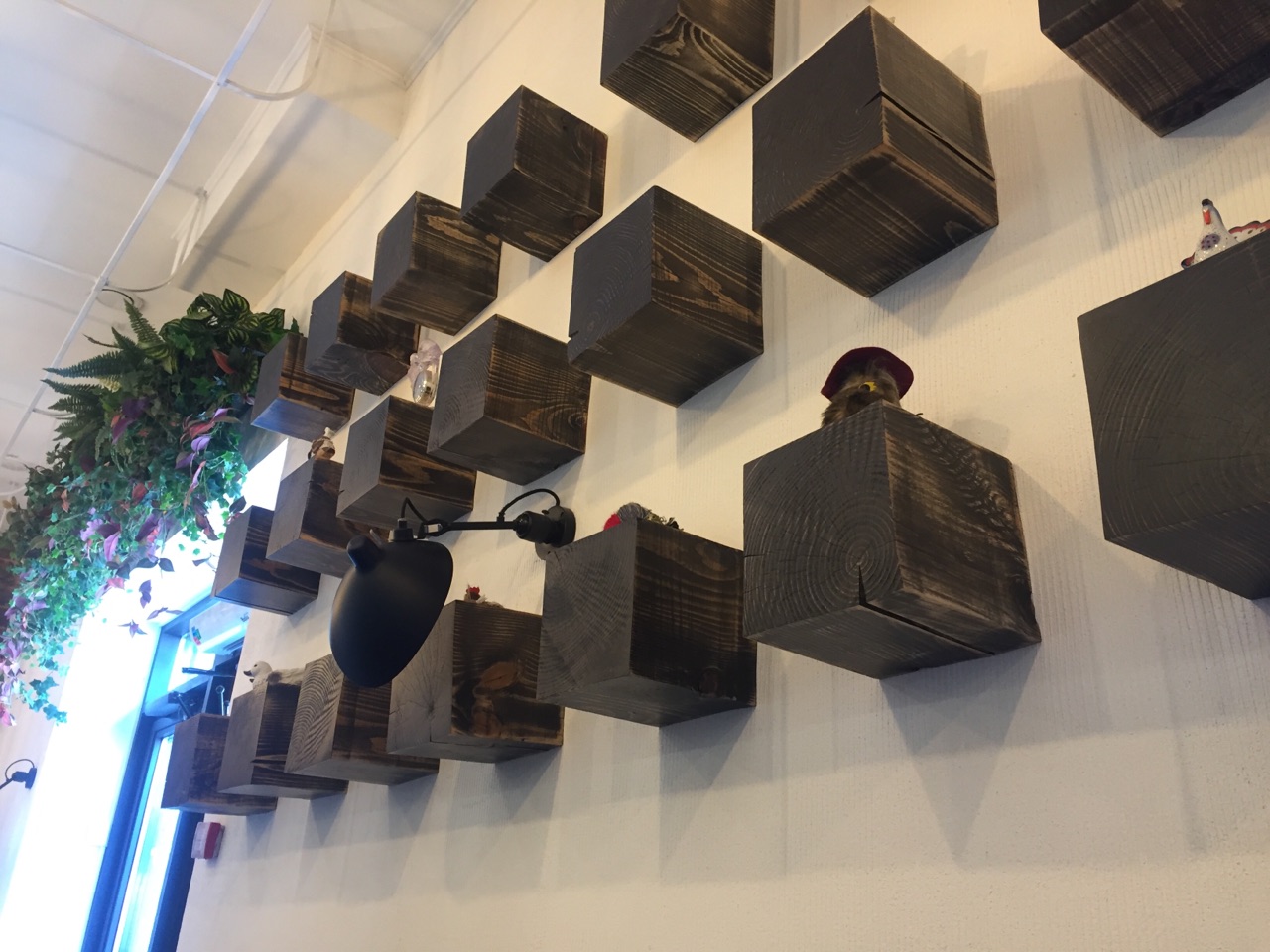 Пространство кафе довольно маленькое, небольшие столики ютятся в непосредственной близости к друг другу. Складывается впечатление, что заведение рассчитано на постоянно сменяющийся поток посетителей: одни быстро едят и уходят, другие приходят им на смену.