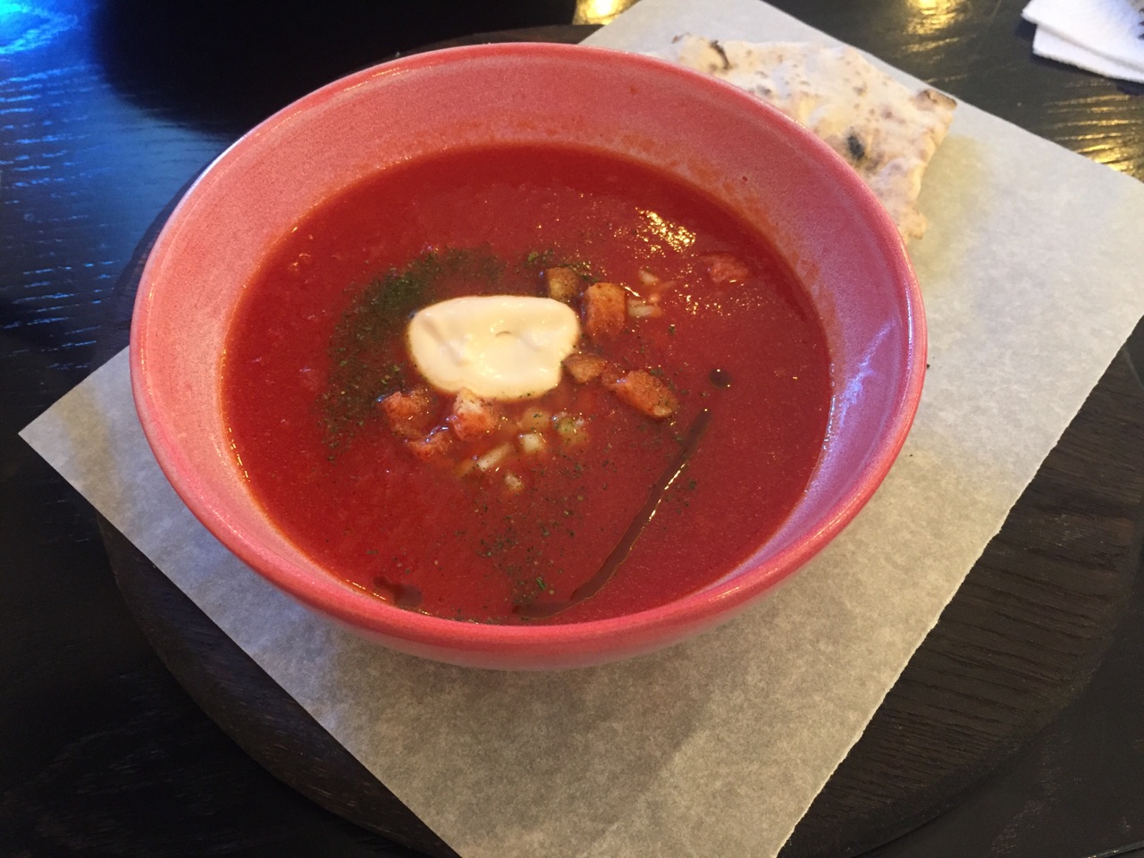 Вскоре настала очередь легкого холодного супа из перетертых в пюре свежих овощей. Гаспачо подали в тарелке и на доске, на которой также лежала четверть лепешки. По причинам, известным лишь персоналу, обещанный на выбор багет так и не предложили.