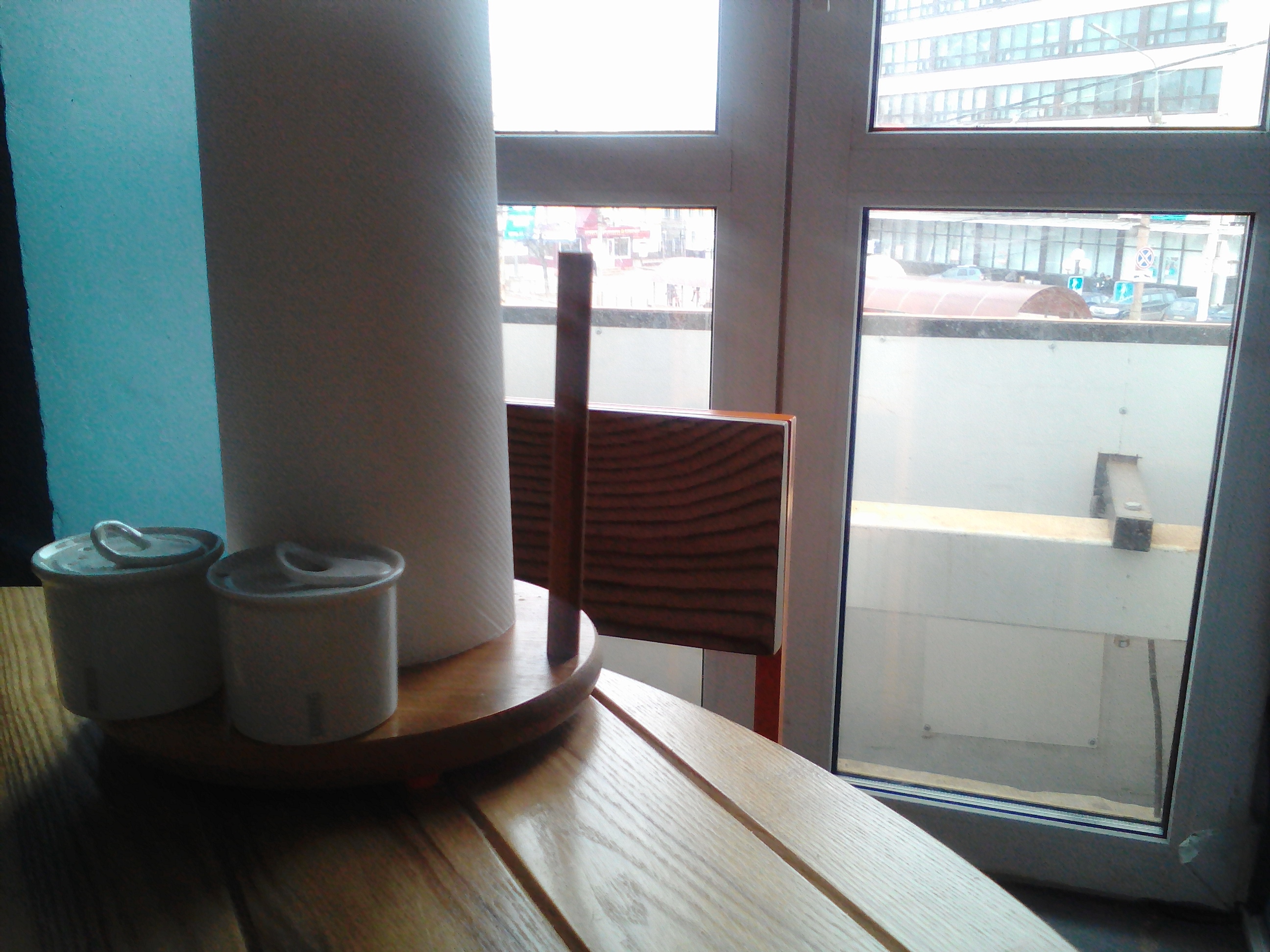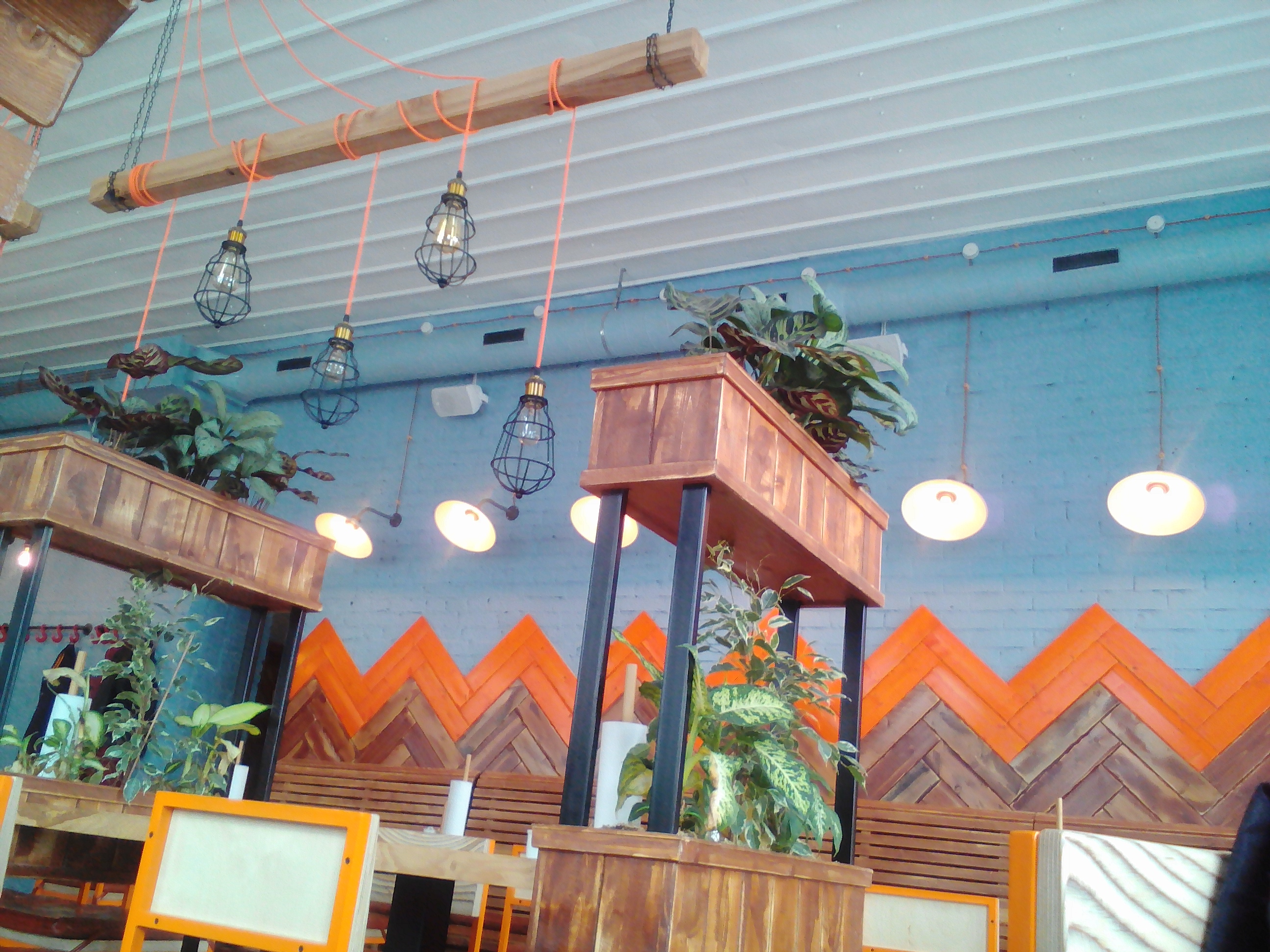 Заведение очень современное. Помещение в стиле лофт, однако, уже на шаг впереди классического проявления этого стиля. Палитра здесь более цветная: голубой, оранжевый, коричневый (древесный) и зеленый. Много живых растений, лампы Эдисона виснут на длинных цветных проводах с белого потолка (кстати, ламп тут более чем достаточно, можно даже сказать – перебор, но дизайнеру виднее). Солонка и перечница в виде консервных баночек. На каждом столе вместо салфеток – рулон бумажных полотенец. Вообще, весь внешний, точнее внутренний вид чем-то напоминает морской, хотя ничем он себя не выдает. Видимо, голубой цвет так работает. Еще раз отмечу уборную, она удивляет раковиной на цельном куске дерева и плиткой, которую я не стала фотографировать по этическим соображениям.