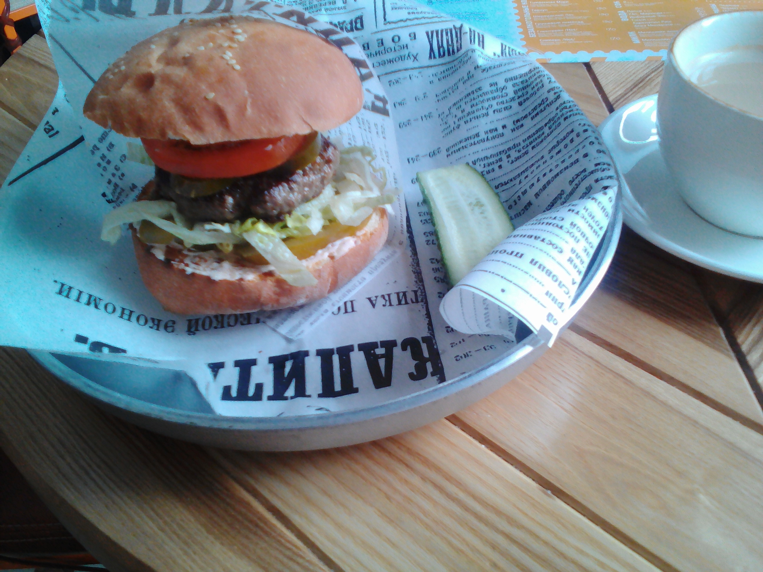 Мальчик в красной клечатой рубашке вежливо принял мой заказ. Долго ждать не пришлось. Мой капучино порадовал своим объемом. Он действительно большой! А вот когда принесли бургер, я немного оробела. Как это есть? Он похож на ядерный гриб. Булки огромные, котлетка маленькая, салат во все стороны. Внимательно оглядев стол, приборов я не обнаружила. Настоящая неприступная башня. Но делать нечего – пришлось покорять.