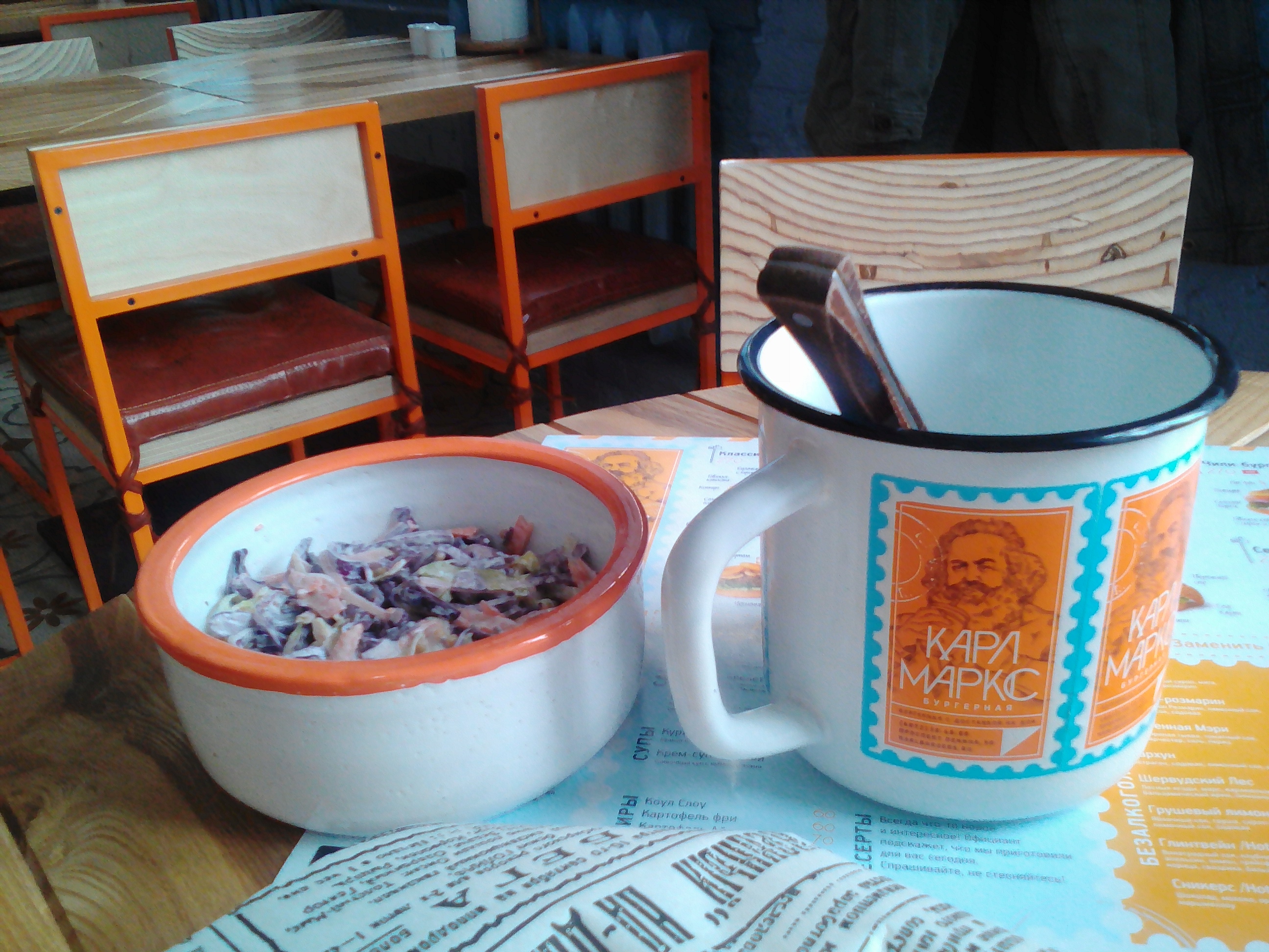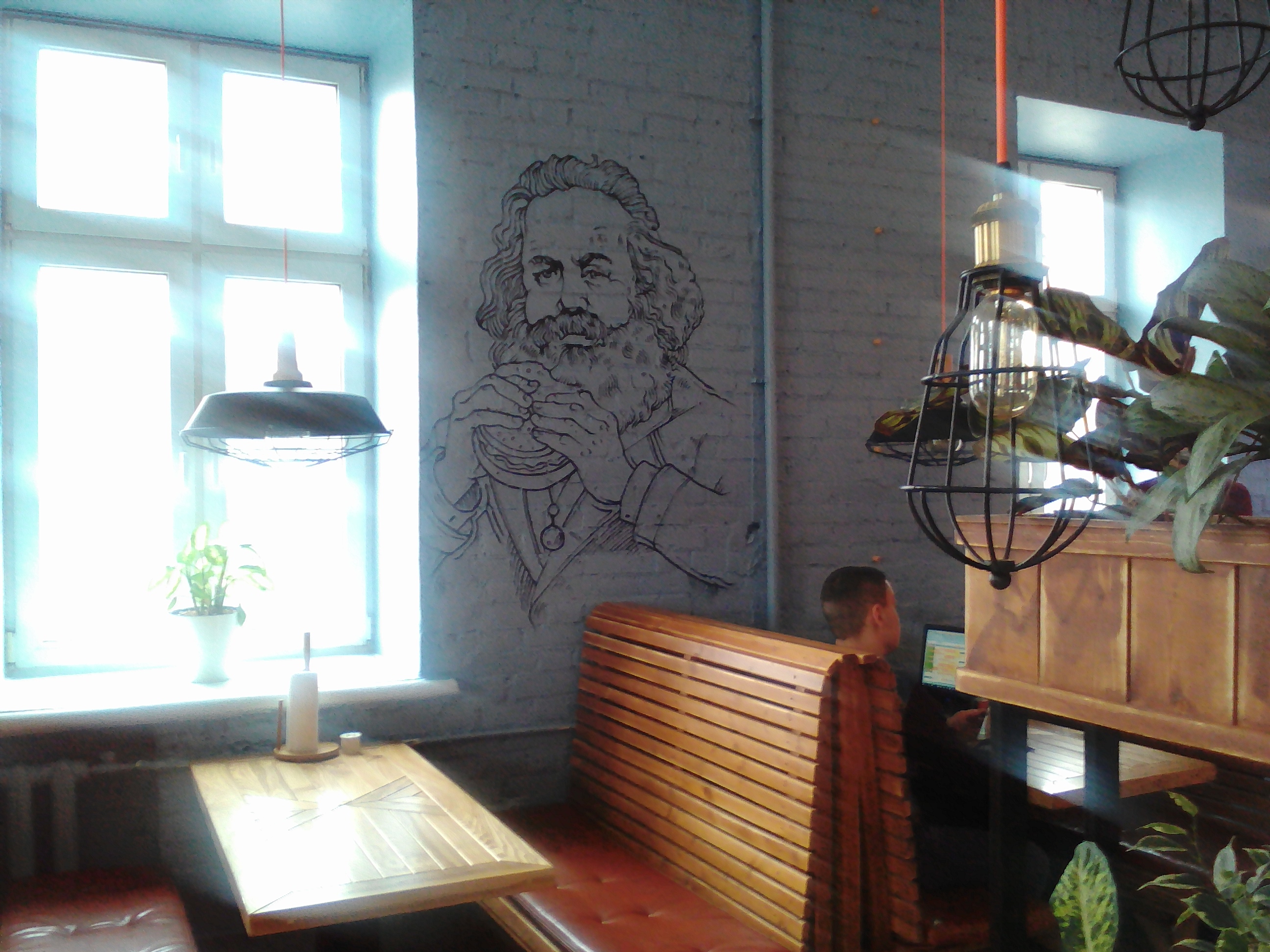 Недавно в Туле, на проспекте Ленина в районе ост. Каминского открылась бургерная «Карл Маркс». Немецкий философ, конечно, не мог предположить, что его именем когда ни будь назовут модную фаст-фуд забегаловку. Но мода, как говорится, требует жертв, и образ Маркса эксплуатируется там по полной. Трафарет на стене, наклейки на кружках, логотип и даже сахар украшает курчавая бородатая голова, сосредоточенно жующая бургер.