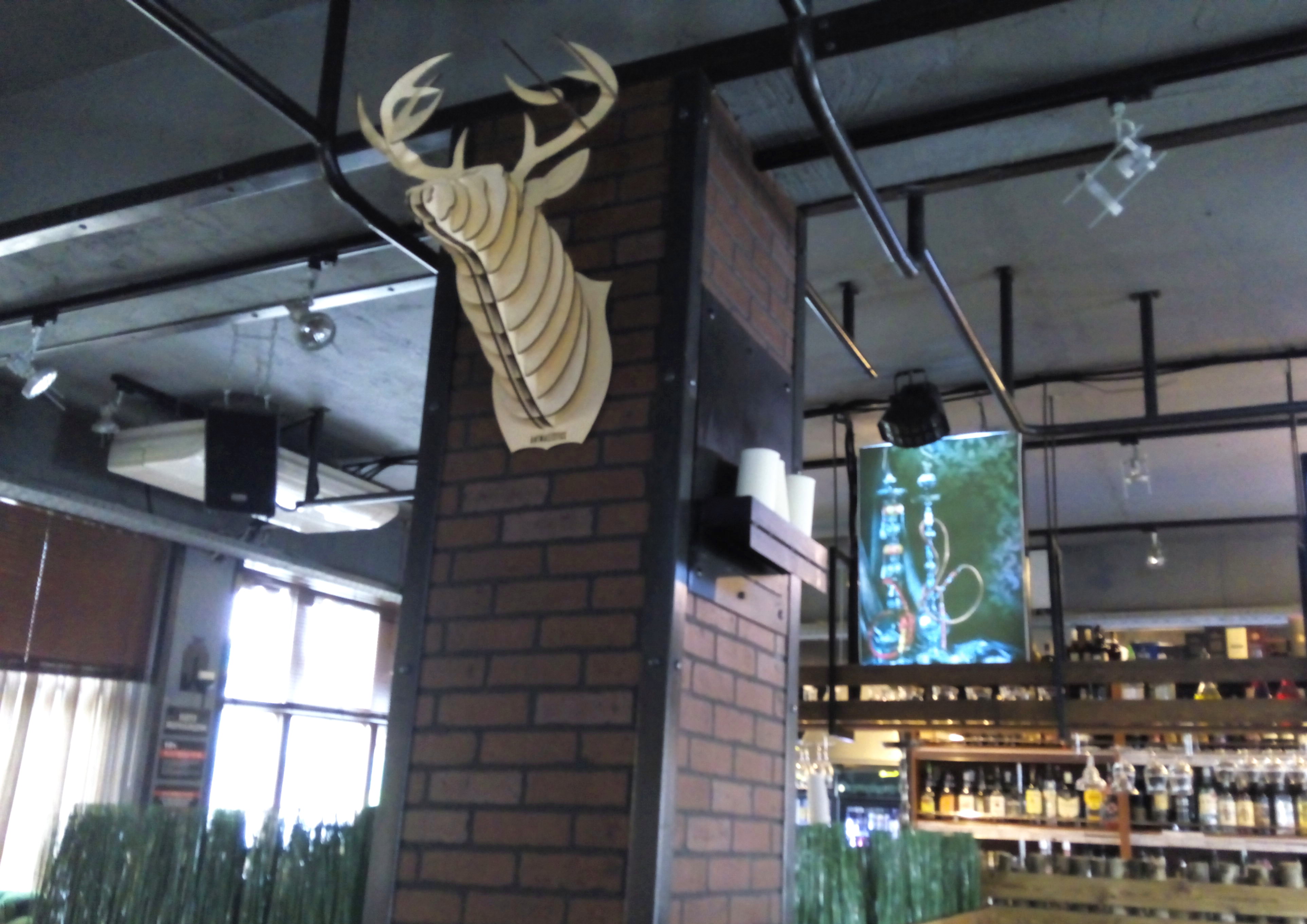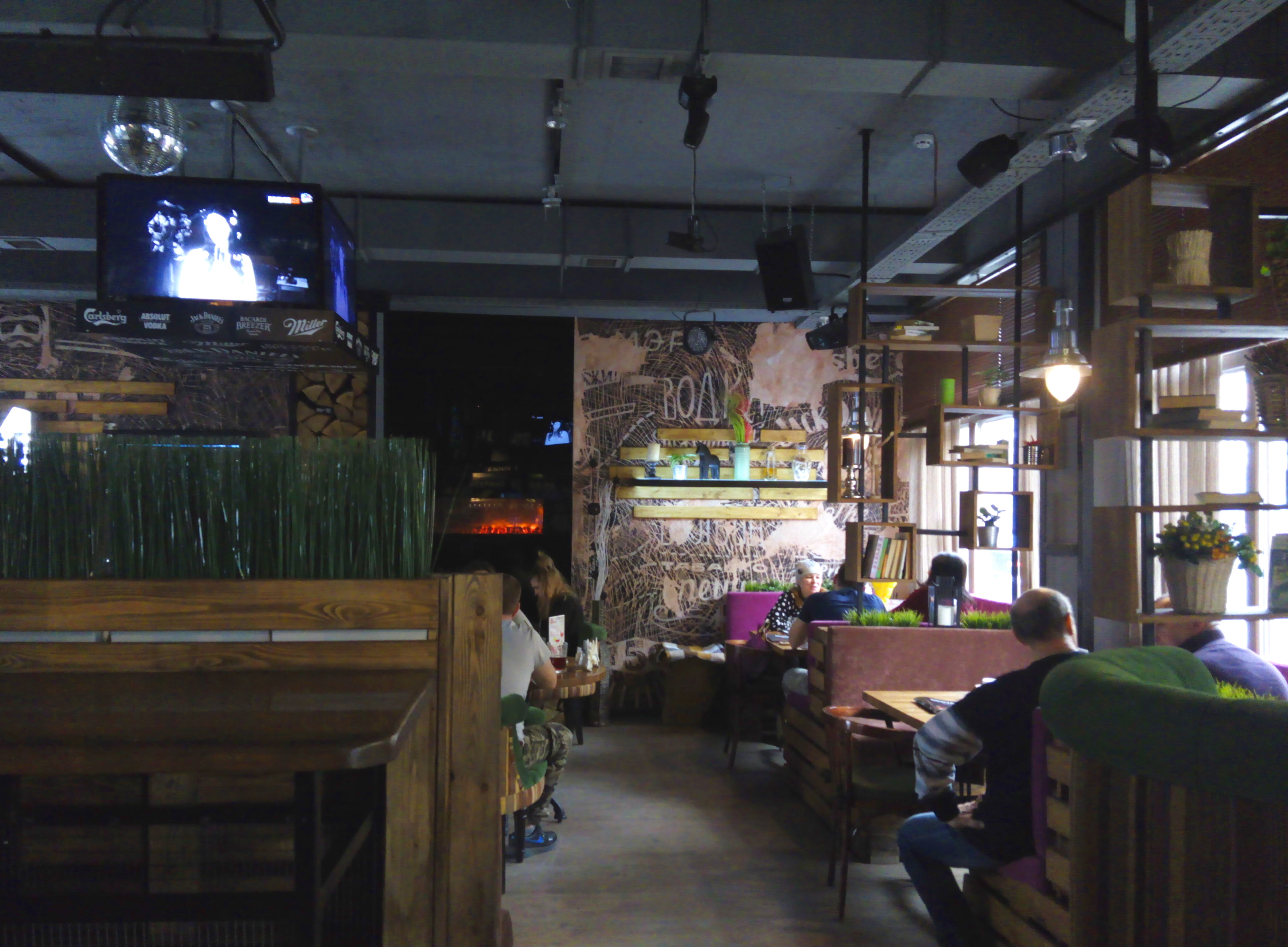 Однако, внутри оказалось куда приятнее. Интерьер удачно скопирован с вышедших из моды лет пять назад модных рестобаров Москвы, но глаз не напрягает и даже создаёт уют. Декор брутален, как пиво-мясо, и мягок, как пенка капучино одновременно. На столах традиционные «байкерские» кожаные подставки под тарелку, на стене — деревянная голова оленя, вдоль окон — зелёная растительность в горшках, а на полках почему-то… книги.