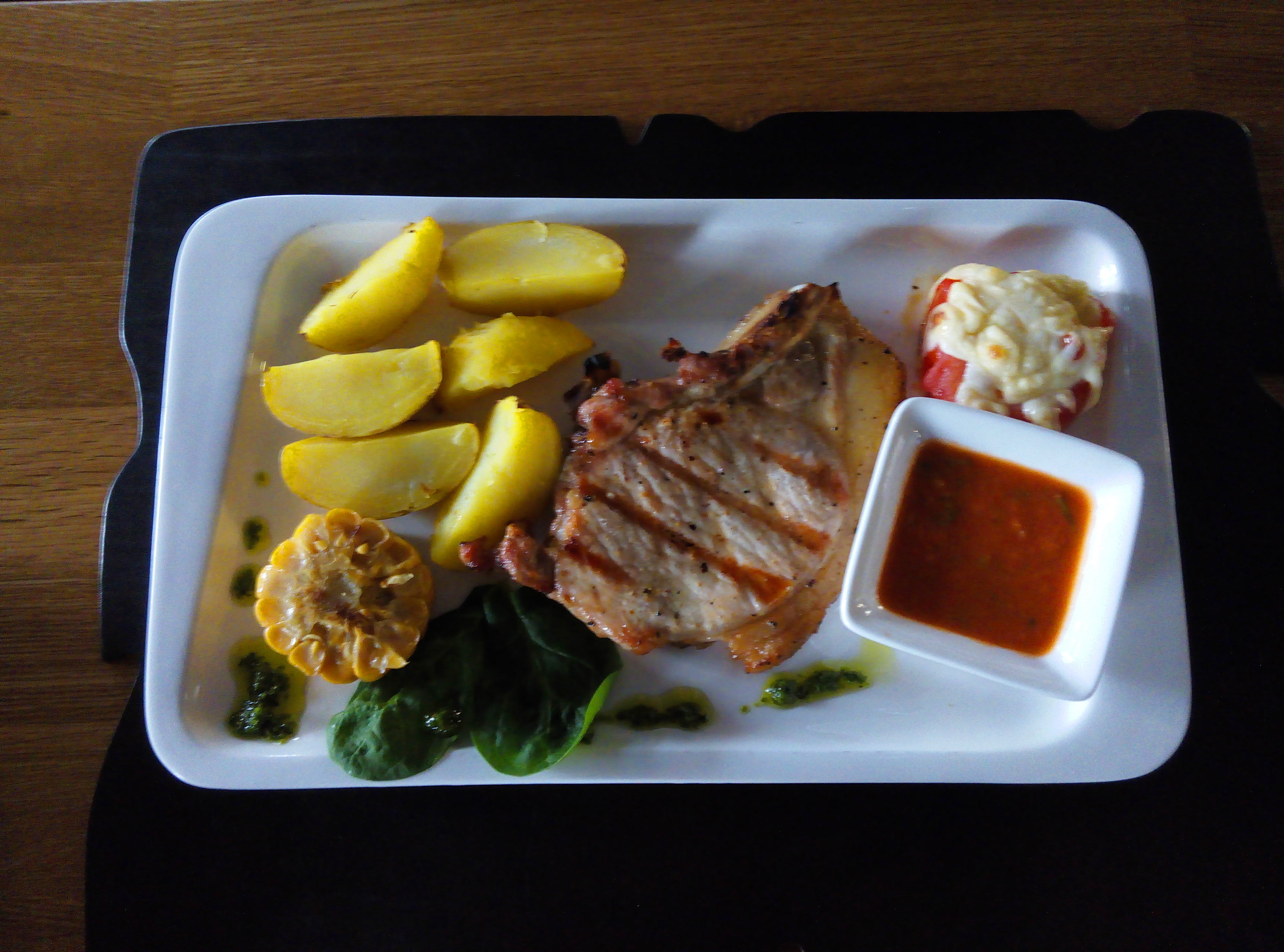 А вот мясо на удивление вкусное. Корейка действительно приготовлена на гриле, хорошо прожарена, мягкая и сочная. Едва прихваченные на гриле овощи довольно пресные и подаются к мясу разве что для красоты.
