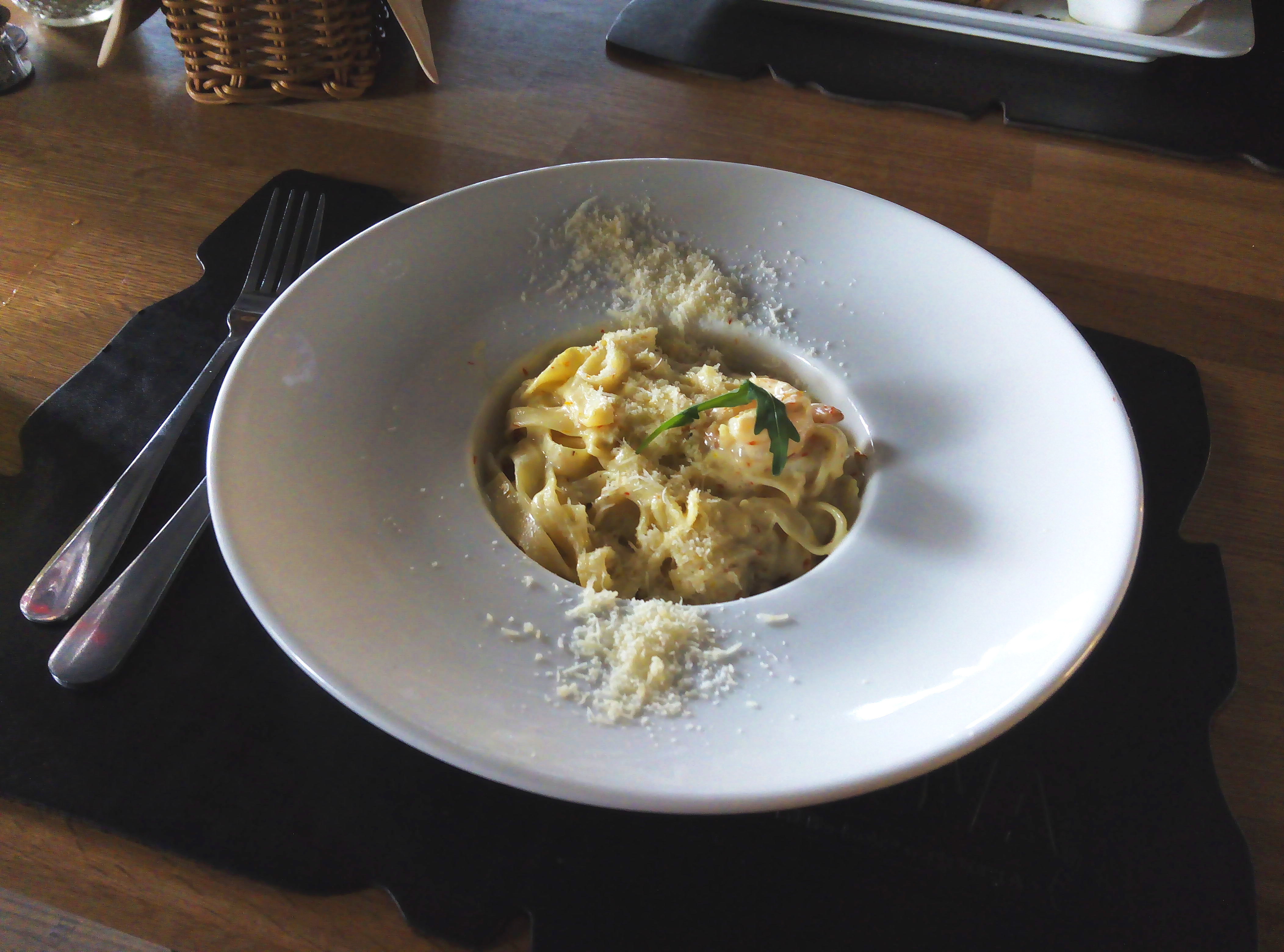 Паста с креветками — это что-то потрясающее! Давно не пробовала ничего вкуснее. Я бы съела ещё. И ещё. Если бы не удручающе микроскопический размер порции — ходила бы сюда только ради этой пасты.
