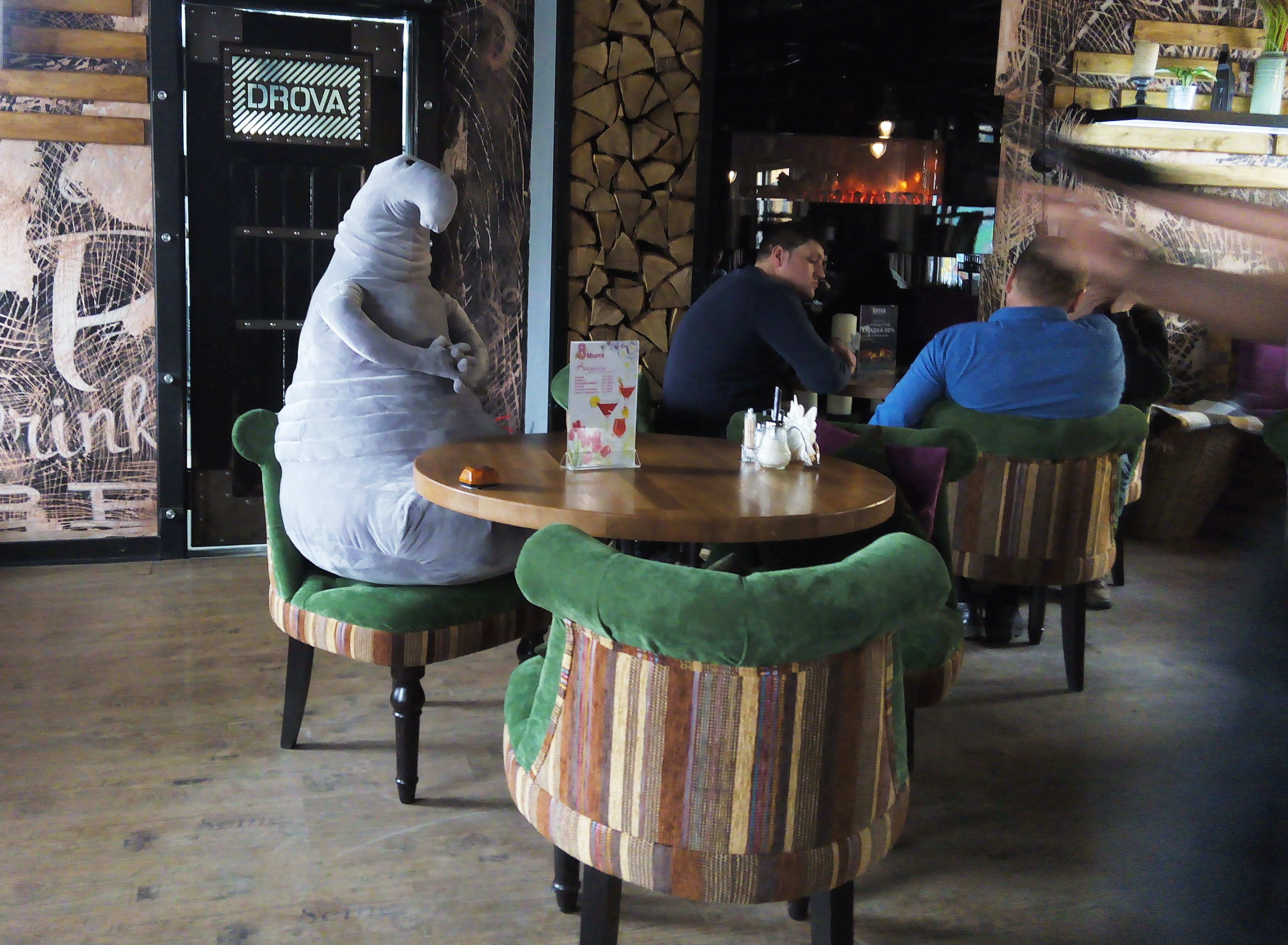 Если столик забронирован — администратор сажает за него огромного плюшевого Ждуна, который «охраняет» место до появления гостя. По-моему, очень мило.