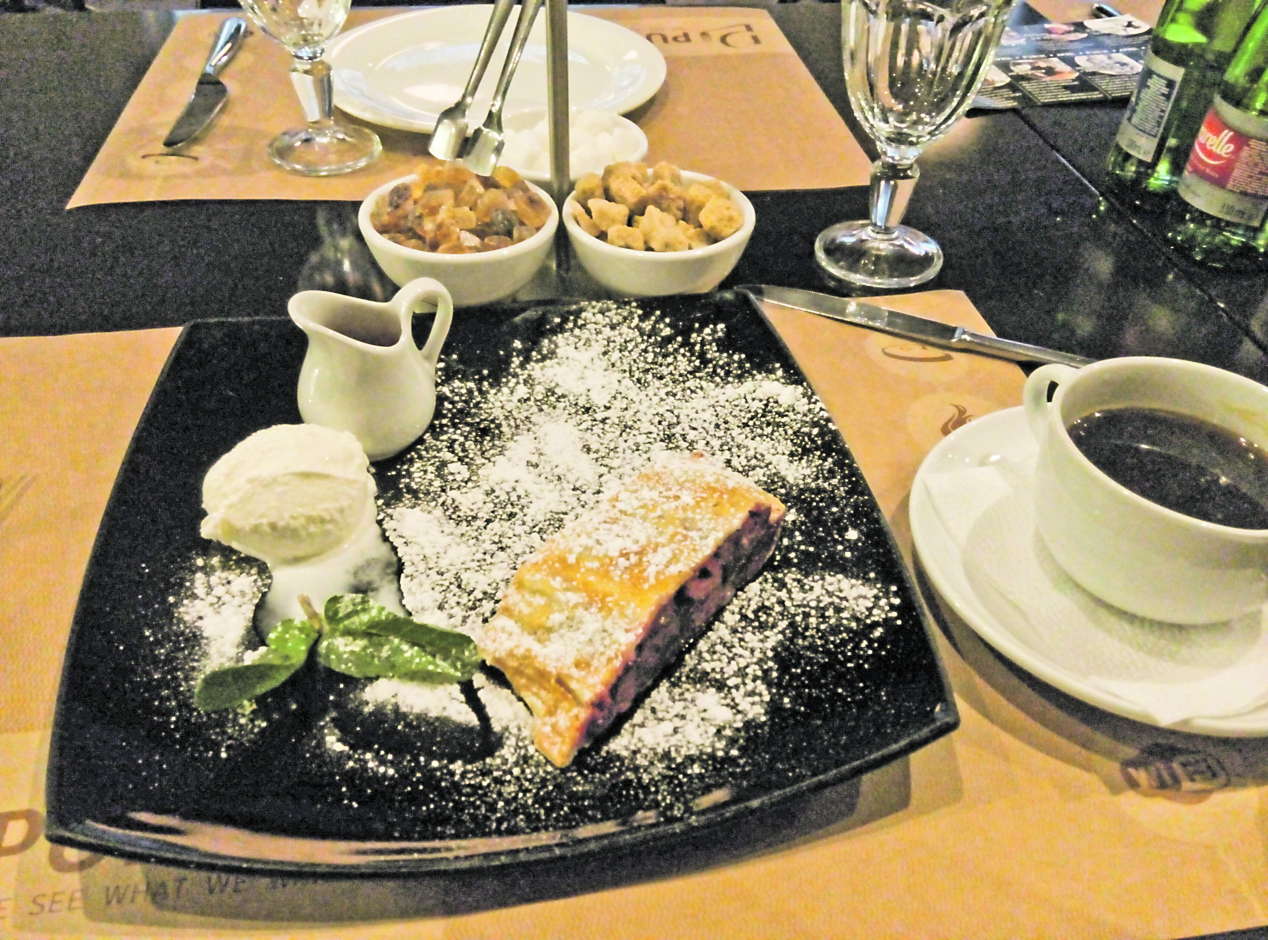 Мой любимый вишневый штрудель, как и положено, принесли с мороженым. В качестве бонуса – какой-то клубничный соус или джем. К кофе подали три вида сахара: тростниковый, леденцовый и обычный – белый. Я, как заядлый кофеман, очень люблю этот напиток с коричневым сахаром, так что и здесь угадали. Кофе, кстати, тоже отличный.
