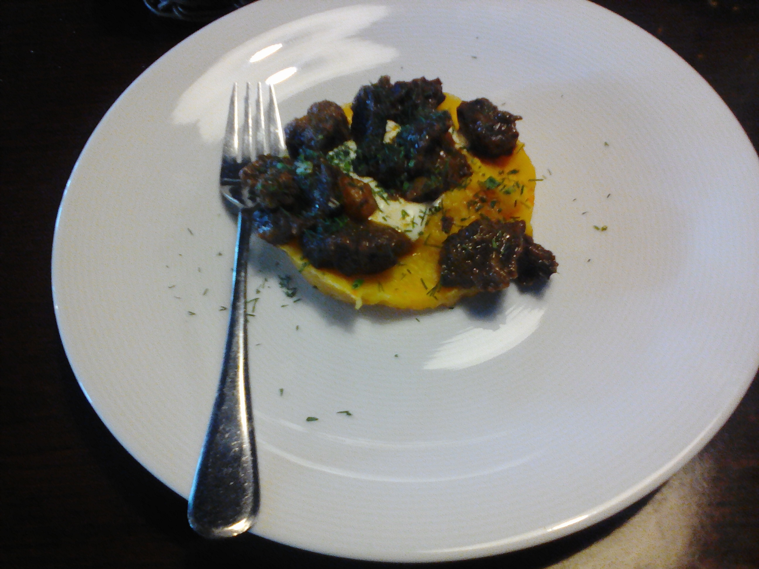 В мой заказ вошли: салат из свежих овощей с кус-кусом (пшеничная крупа, напоминающая мелкий рис), виноградом, слайсами вяленой свеклы, апельсинами, огурцом, помидорами черри под оливково-лимонным фрешем. Стоит 210р, вес 170 г. Телячьи щечки (как бы ужасно это не звучало) с тушеными овощами в соусе «Деми Глас» (подаются с морковным пюре и сырным соусом). 290р, всего обещали 330 г. А также яблочный сок 70р.