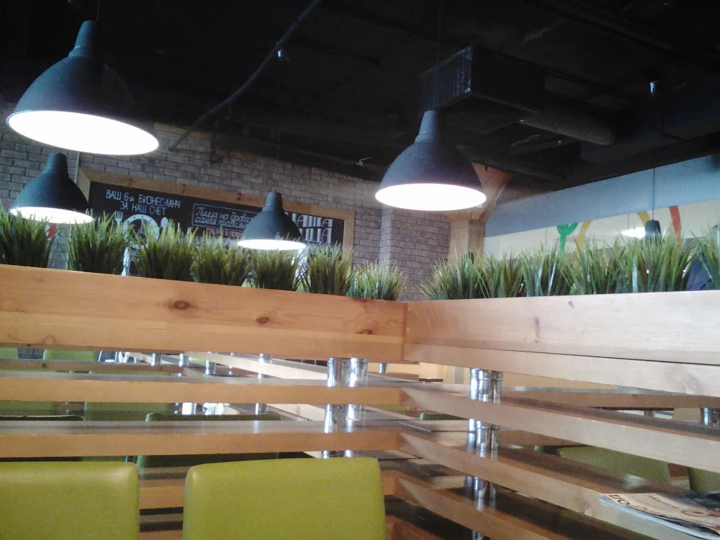 Металлические вешалки-стойки, салатовые стулья, бежевые диванчики, реечные перегородки, черный потолок (намек на избитый стиль «лофт»), массивные плафоны, черные доски с написанной мелом информацией по меню, искусственные цветы и трава. И моментально возникает мысль «это уже где-то было». Заурядно, однообразно, без особых на что либо претензий. Столы на достойном расстоянии друг от друга. В целом довольно милое, ненавязчивое оформление.